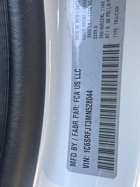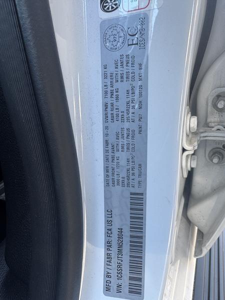 2021 RAM 1500 Laramie Crew Cab Short Box 4WD, 5.7L, 8 cylinder, 4 door, automatic, 4WD, 4-Wheel ABS, cruise control, air conditioning, AM/FM radio, power door locks, power windows, power mirrors, power sunroof, white exterior, black interior, leather. Bluetooth, power adjustable foot pedals, auto start/stop, backup camera, front heated seats, front ventilated seats, rear heated seats, front power seats, driver’s memory seat, heated steering wheel, trailer brake controller, tow/haul mode, parking sensors, power moonroof, trailer hitch receiver, tonneau cover, wireless charger.
