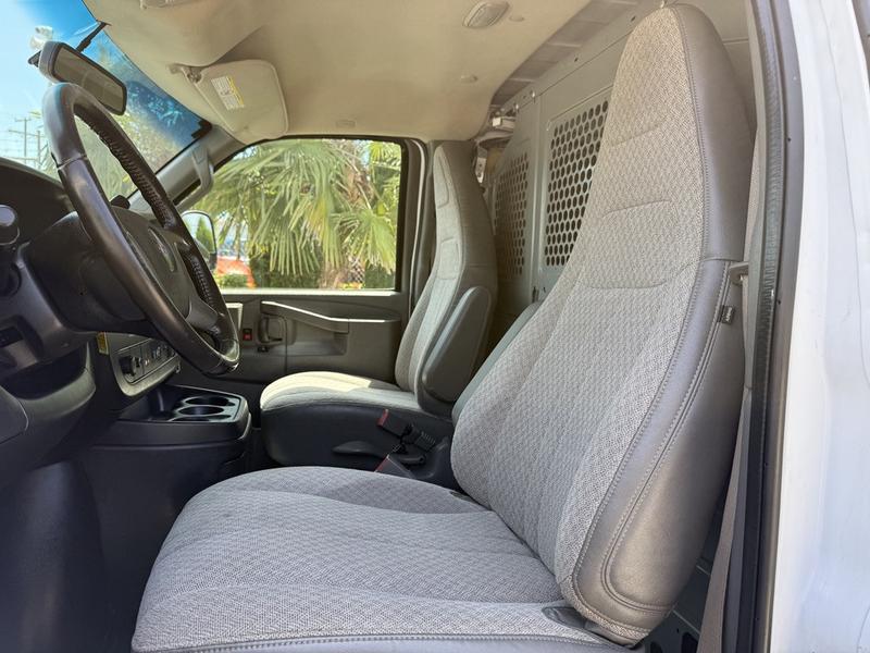 2017 GMC Savana 2500 Extended Cargo Van with Shelving and Bulkhead Divider, 4.8L, 8 cylinder, 3 door, automatic, RWD, 4-Wheel ABS, air conditioning, cruise control, AM/FM radio, white exterior, beige interior, cloth. Aluminum shelving, backup camera, Bluetooth.