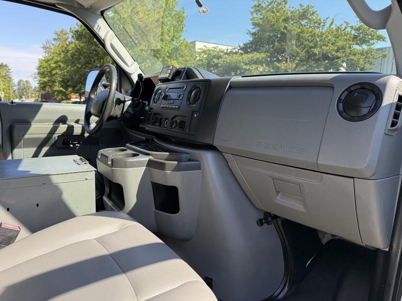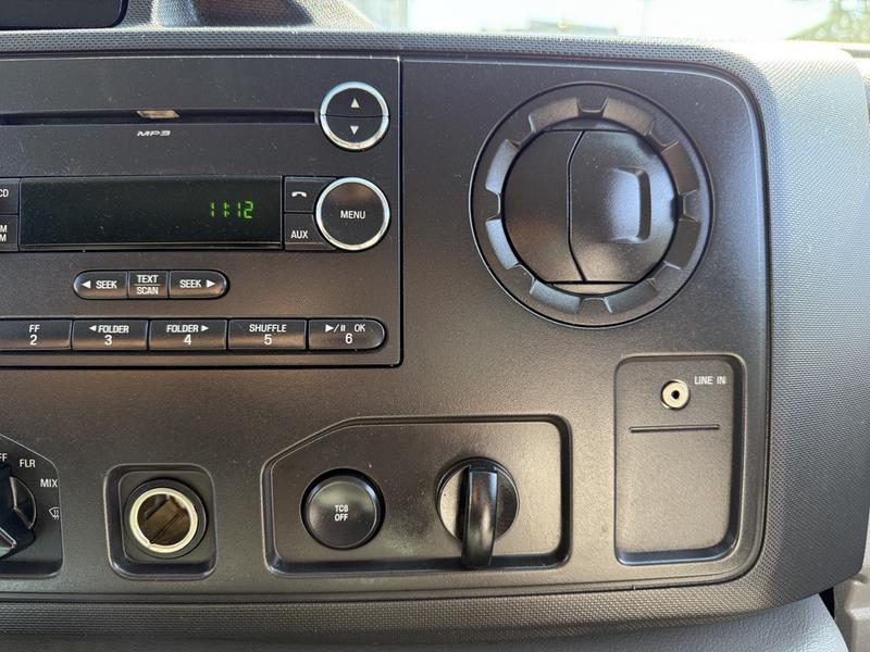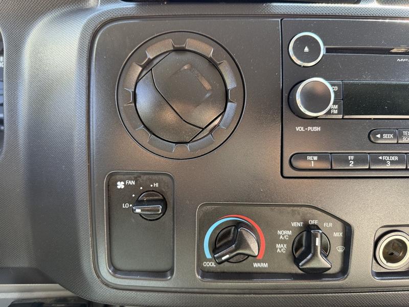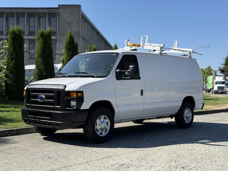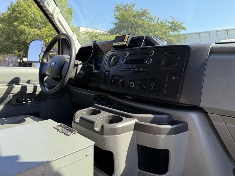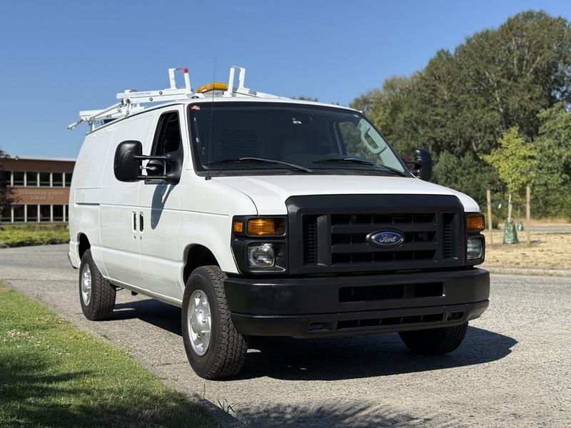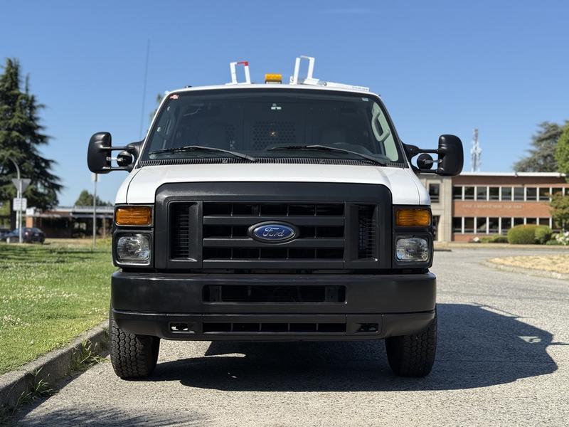 2011 Ford Econoline E-350 Super Duty Cargo Van with Shelving & Ladder Rack, 5.4L, 8 cylinder, 2 door, automatic, RWD, 4-Wheel ABS, air conditioning, AM/FM radio, CD player, power door locks, power windows, power mirrors, white exterior, grey interior, vinyl. Traffic signaler, wooden shelving, trailer hitch, trailer brake.