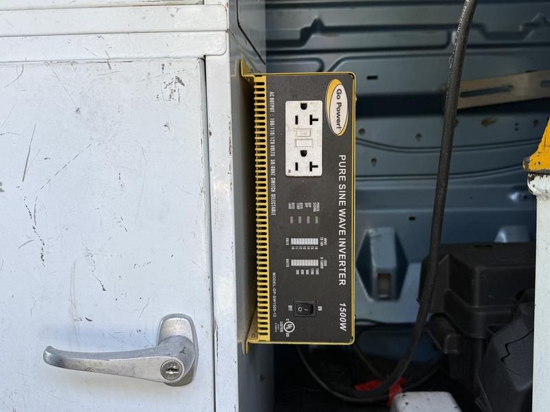 2006 Ford Econoline E-350 Cargo Van with Versalift Bucket, 5.4L, 8 cylinder, 3 door, automatic, RWD, 4-Wheel ABS, AM/FM radio, CD player, blue exterior, grey interior, cloth. Versalift VT28B 29' height, Go Power 1500W inverter, Alpine IVA-W205 head unit, beacon lights.