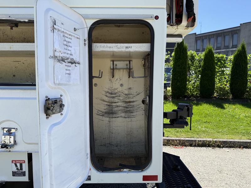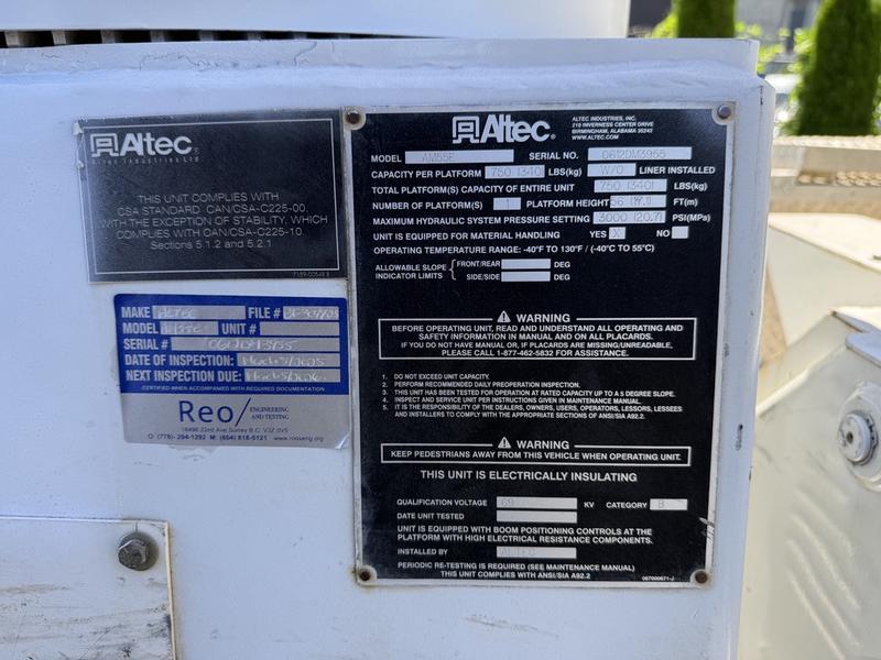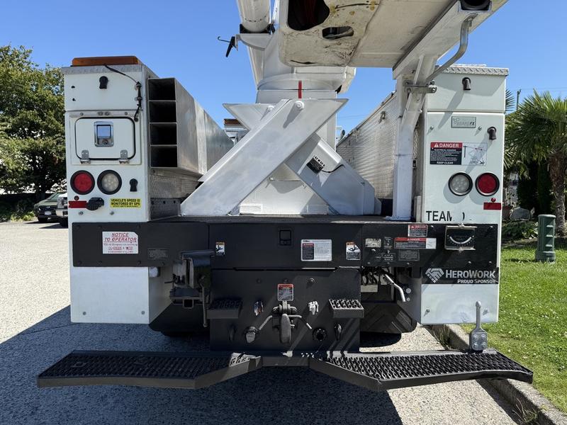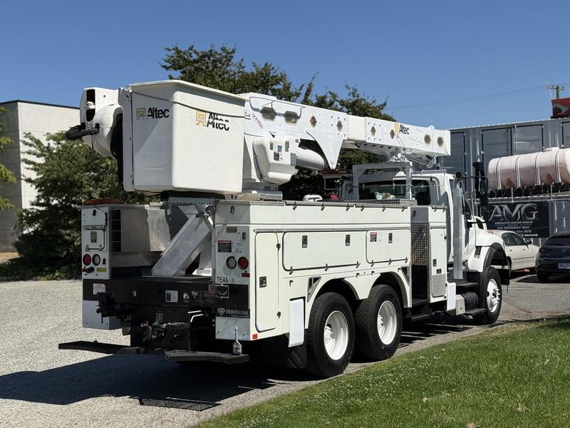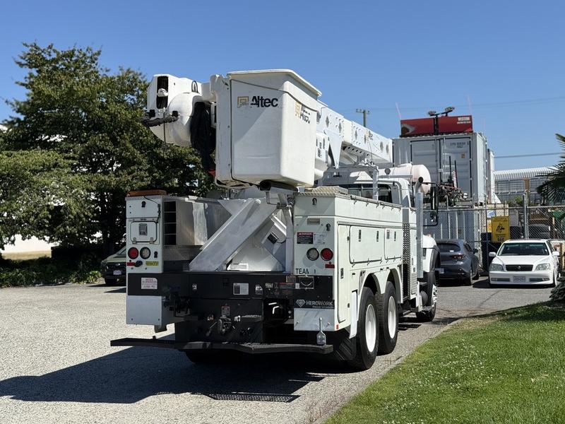 2013 International 7400 Workstar Altec Bucket Truck with Air Brakes, 9.3L, 6 cylinder, 2 door, automatic, 6X4, air conditioning, AM/FM radio, white exterior, grey interior, vinyl. GVWR 24,494 kg / 54,000 lbs, Bucket platform capacity 700 lbs, platform height 56 ft. Bucket certification valid until March 5, 2026.