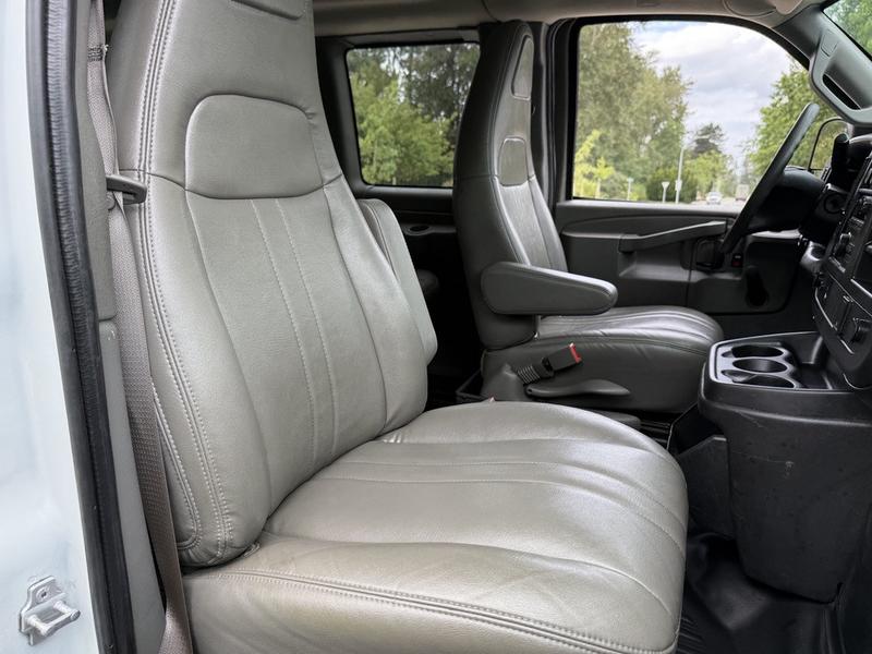 2021 Chevrolet Express LS 3500 Extended Passenger Van with seating for up to 12 including the driver. Powered by a 4.3L V6 engine and rear-wheel drive, this full-size van includes cruise control, 4-Wheel ABS, air conditioning, AM/FM radio, and a leather interior. A dependable option for shuttle services, group transport, or commercial use. Finished in white with a grey interior.