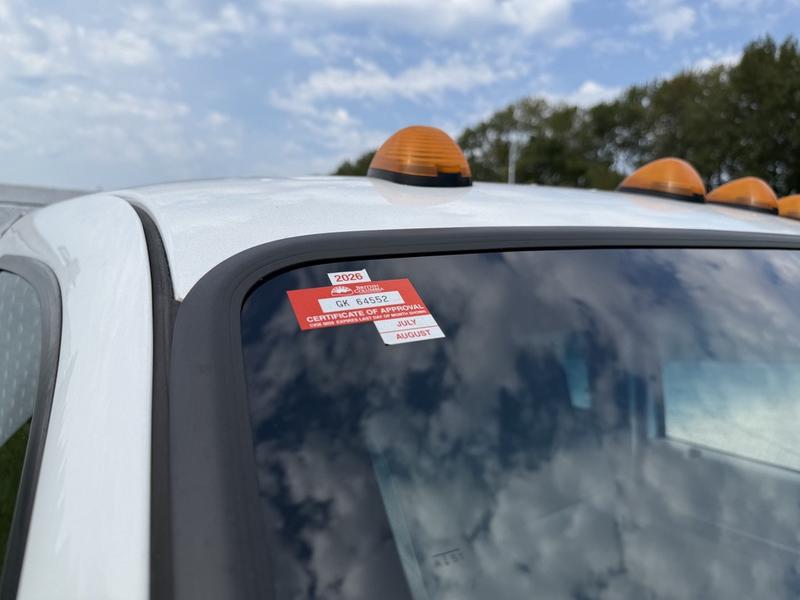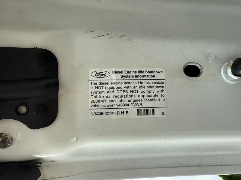 2008 Ford F-450 SD SuperCab Dually Diesel 11-Foot Flat Deck 2WD with Storage Compartments, 6.4L, 8 cylinder, 4 door, automatic, RWD, air conditioning, AM/FM radio, white exterior, tan interior, vinyl. Deck is 11 feet 4 inches long by 8 feet wide. Certification and decal valid until August 2026.