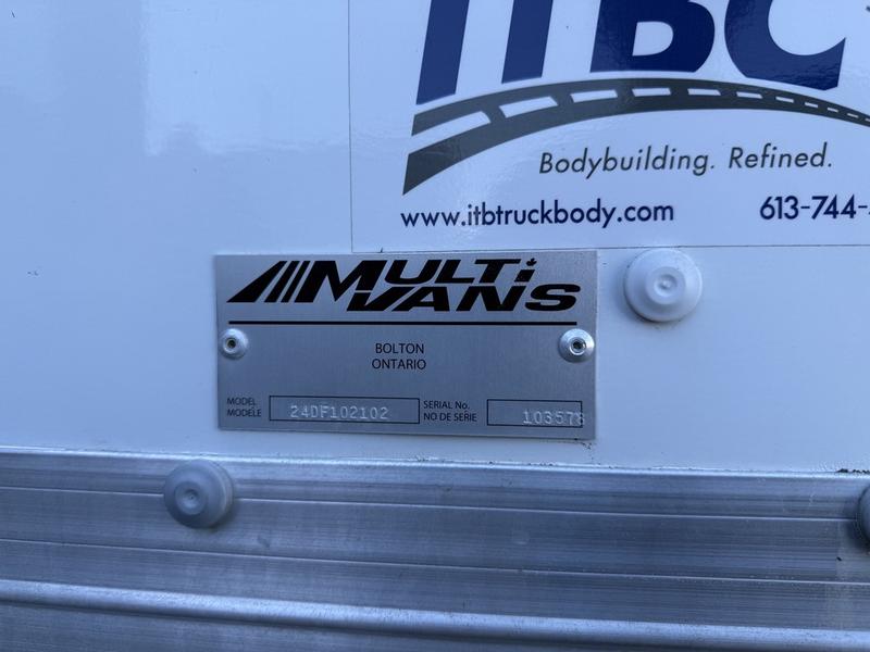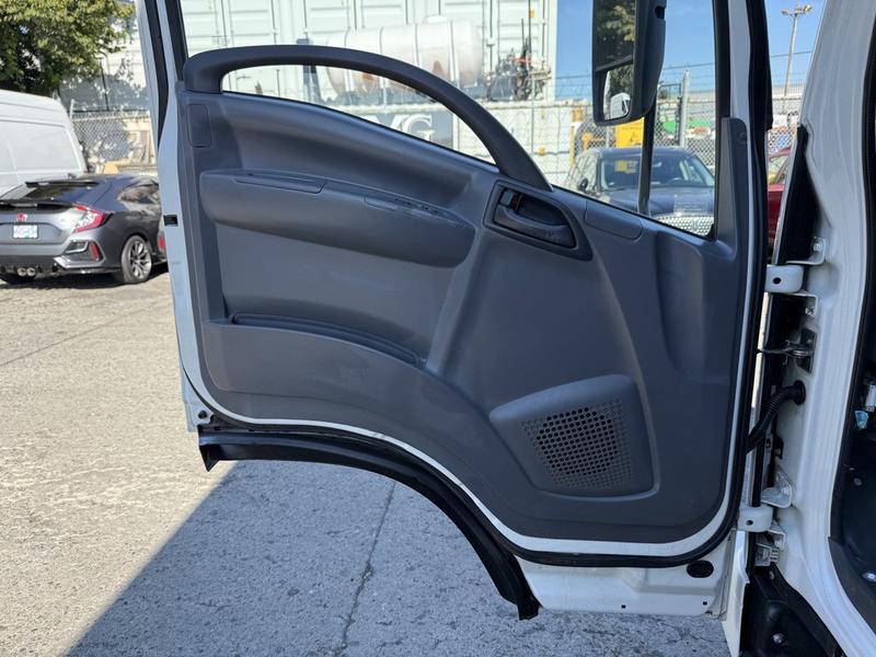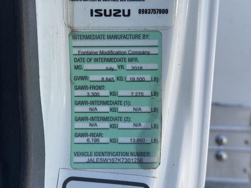 2019 Isuzu NRR Diesel 24-Foot Cube Van with Rear Side Doors, 5.2L, 4 cylinder, 2 door, automatic, 4X2, air conditioning, AM/FM radio, CD player, white exterior, grey interior, cloth. The inside of the box measures 24 feet long, 8 feet 4 inches wide, and 8 feet 9 inches high. Overall vehicle dimensions are 32 feet 4 inches long, 8 feet 6 inches wide, and 12 feet high. GVWR is 8,845 kg (19,500 lbs). Certification and decal valid until September 2026.