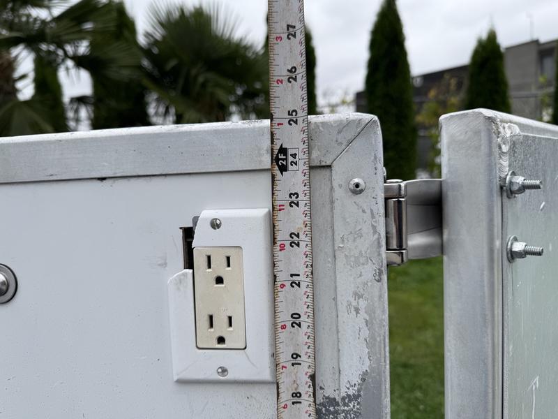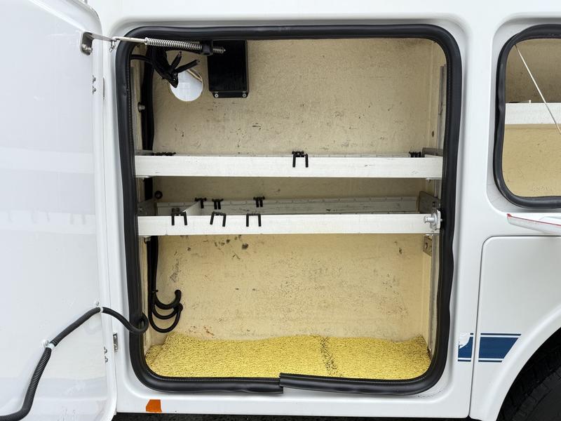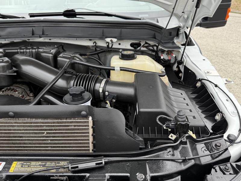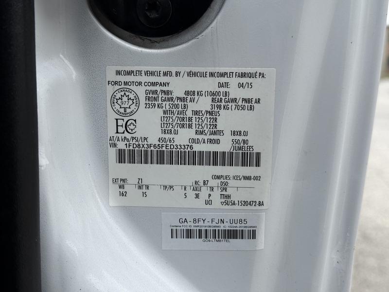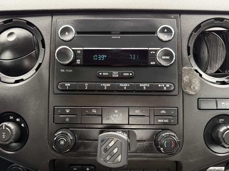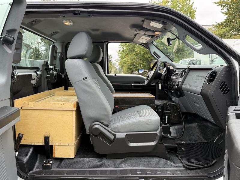 2015 Ford F-350 SD SuperCab 4WD Service Truck, 6.2L, 8 cylinder, 4 door, automatic, 4WD, 4-Wheel ABS, cruise control, air conditioning, AM/FM radio, CD player, power door locks, power windows, power mirrors, white exterior, grey interior, cloth interior. Equipped with a service box featuring interior measurements of 9 feet long, 4 feet 2 inches wide, and 2 feet 1 inch high. Includes a 4X4 gear selector. Overall vehicle dimensions are 22 feet 7 inches long, 7 feet wide, and 6 feet 9 inches high. Certification and Decal valid until November 2026.
