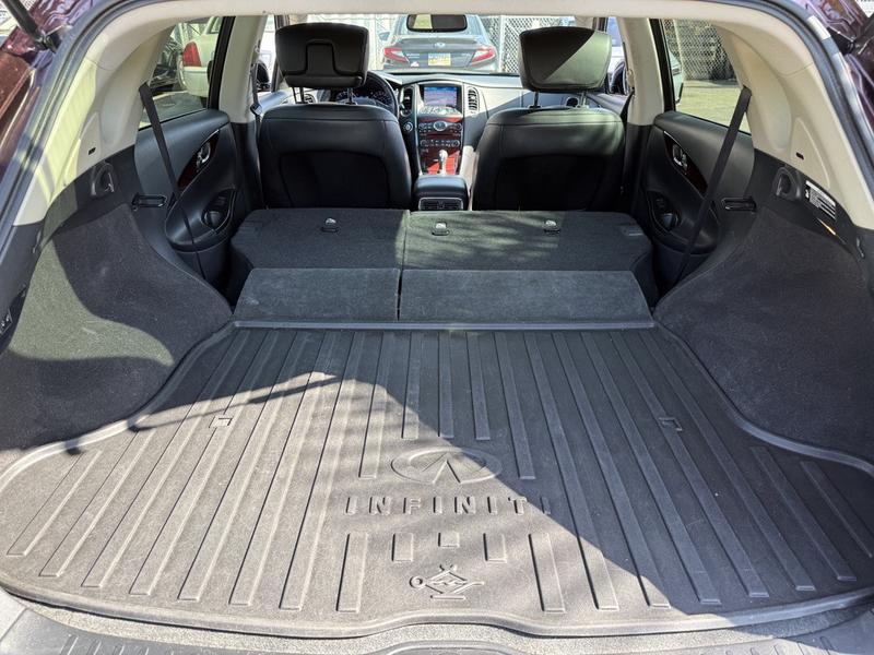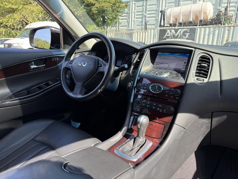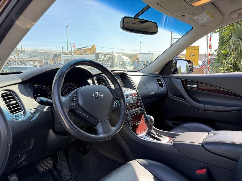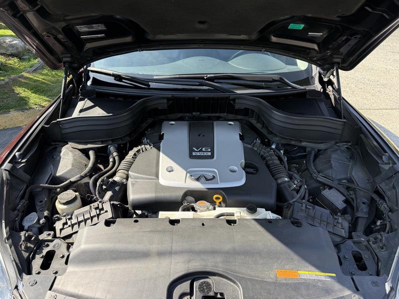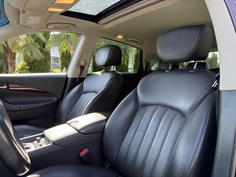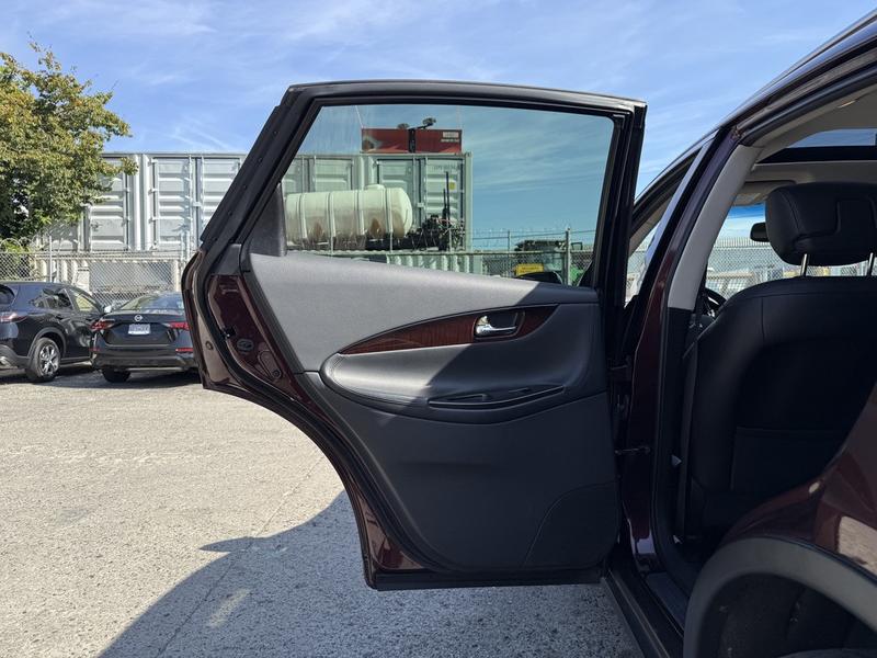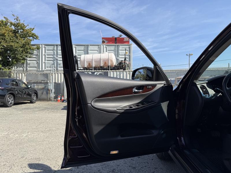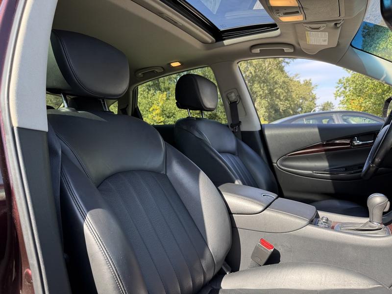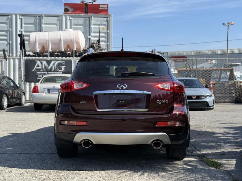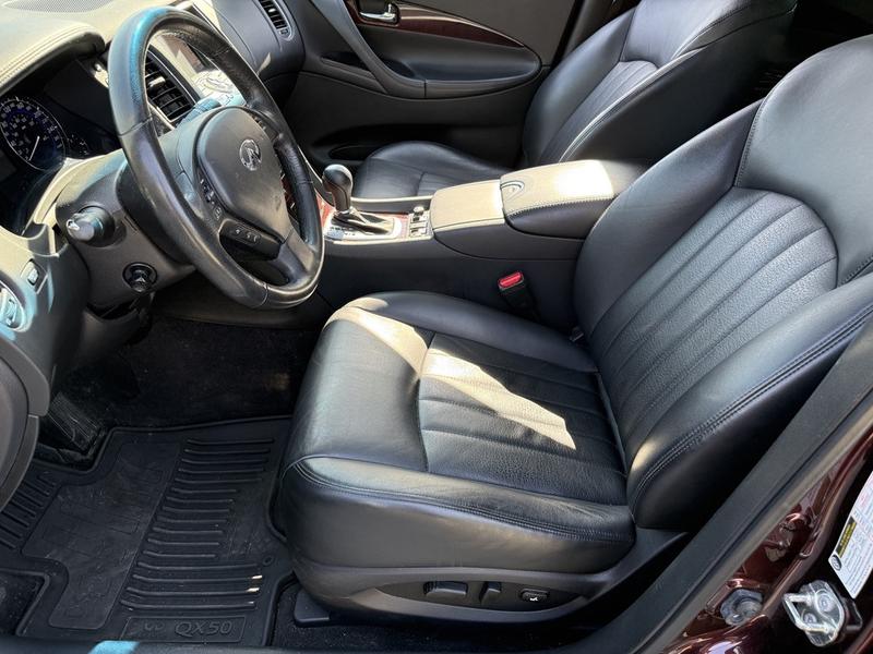 2017 Infiniti QX50 AWD, 3.7L, 6 cylinder, 4 door, automatic, AWD, 4-Wheel ABS, cruise control, air conditioning, AM/FM radio, power door locks, power windows, power mirrors, burgundy exterior, black leather interior. Features include a 3.7L V6 engine, navigation, Bluetooth connectivity, sunroof, heated and cooled front seats, memory driver seat, and automatic folding rear seats. Equipped with AM/FM/AUX/CD and premium BOSE audio for a refined driving experience.