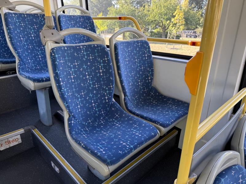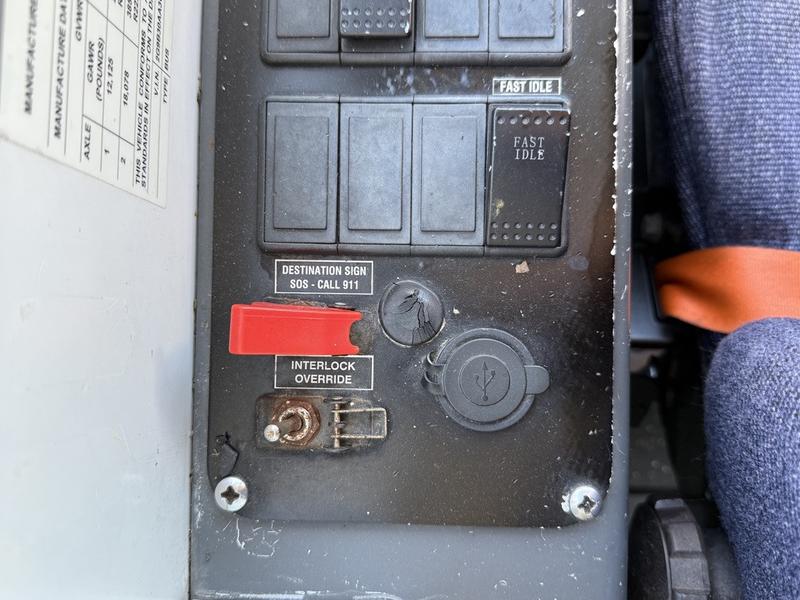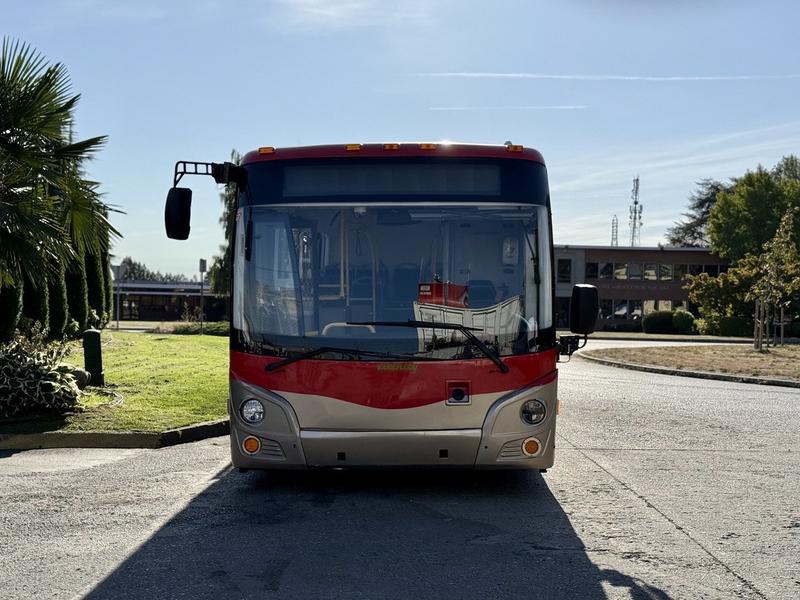This 2016 Grande West Vicinity low-floor kneeling bus runs on a 6.7L 6-cylinder diesel engine with rear-wheel drive and automatic transmission. Finished in red with a blue cloth interior, it seats 25 passengers including the driver and is equipped with a wheelchair ramp and folding seats for improved accessibility. The kneeling suspension lowers the front of the bus to reduce entry height, making it safer and easier for passengers with mobility challenges to board. Ideal for transit operators, assisted living centers, or shuttle programs, it also features air brakes, a backup camera, airbags, and a route display computer. Certification and decal valid until March 2026.