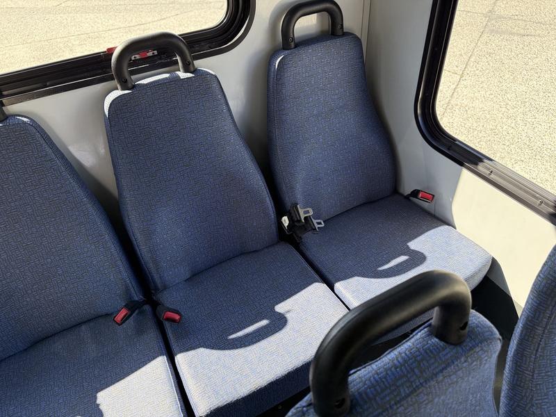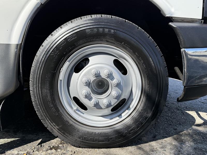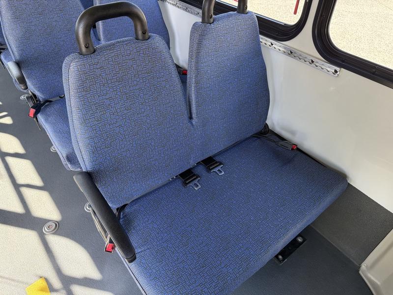 2014 Chevrolet Express G4500 19-Passenger Wheelchair Accessible Kneeling Bus with Duramax Diesel, 6.0L V8 engine, automatic transmission, and rear-wheel drive. This versatile shuttle features a kneeling suspension system that lowers the vehicle for easier boarding, along with a wheelchair ramp for accessible transportation. The bus seats 19 passengers including the driver and comes equipped with a ThermoKing rear air conditioning and heating system, cruise control, an automatic adjustable driver seat, and a body master switch. Finished in white with a blue vinyl interior, this bus is well-suited for senior care facilities, shuttle services, or mobility transport. GVWR is 6,439 kg (14,200 lbs), and overall vehicle dimensions are 26 feet 9 inches long, 8 feet 4 inches wide, and 9 feet 1 inch high. Certification and decal are valid until March 2026.