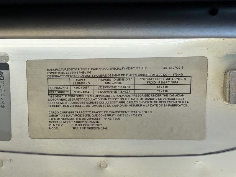 2019 Chevrolet Express G4500 wheelchair accessible bus, equipped with a 6.0L V8 engine, automatic transmission, and rear-wheel drive. This 22-passenger configuration (including the driver) includes a wheelchair ramp for improved accessibility, making it a practical solution for transit operators, care homes, and community shuttle programs. Interior features include AM/FM radio, air conditioning and heat, cruise control, and a master body switch. Finished in grey with a blue vinyl interior, this unit measures 244 inches long, 79 inches wide, and 84 inches high. GVWR is 6,441 kg (14,200 lbs). Built for comfort, reliability, and accessibility.
