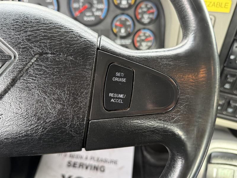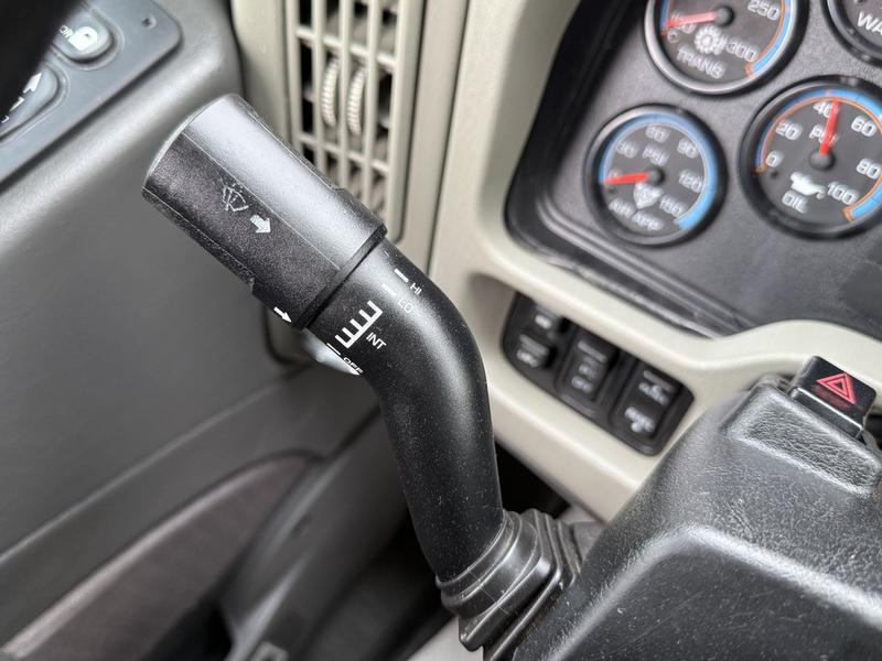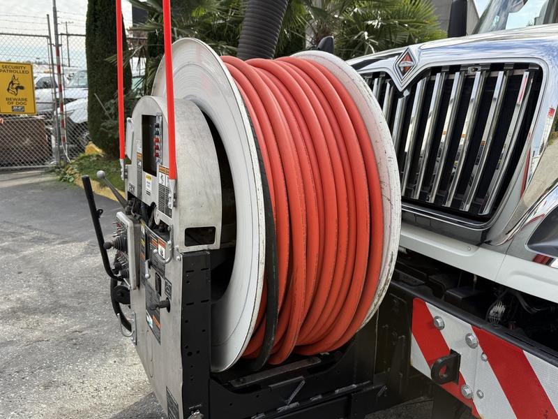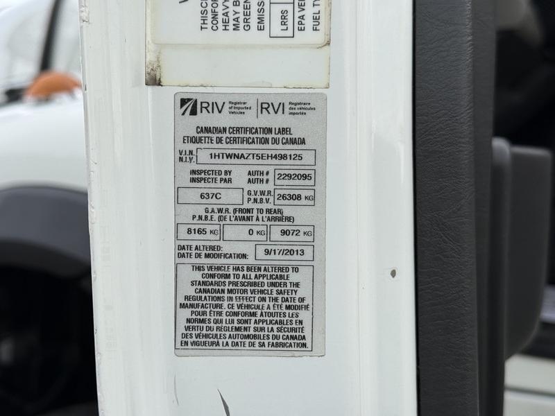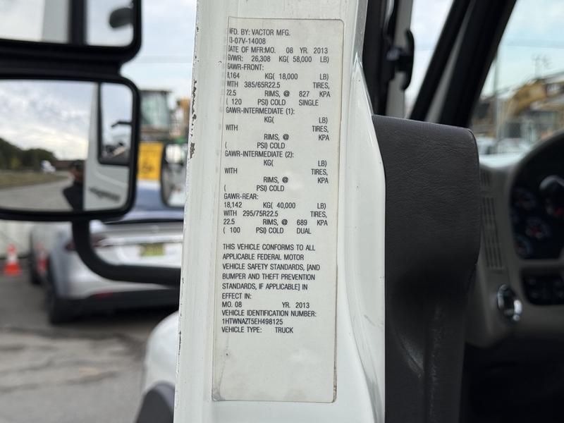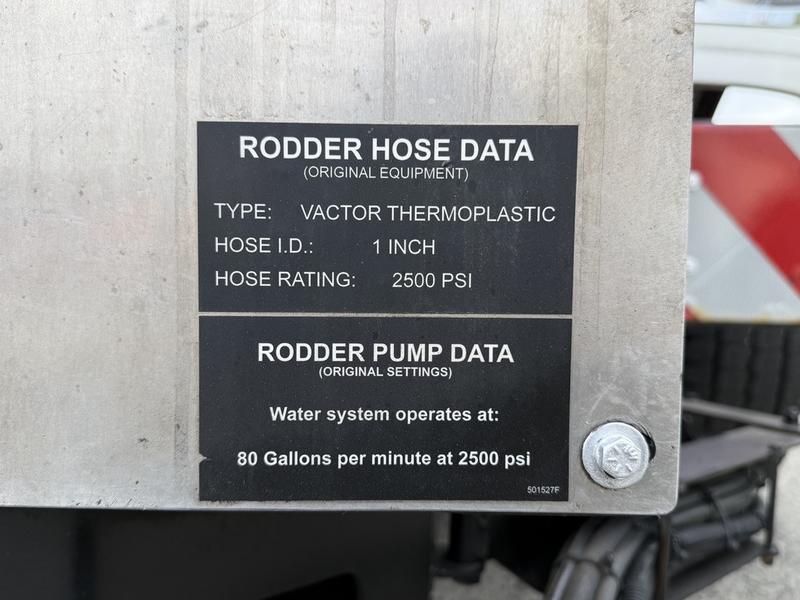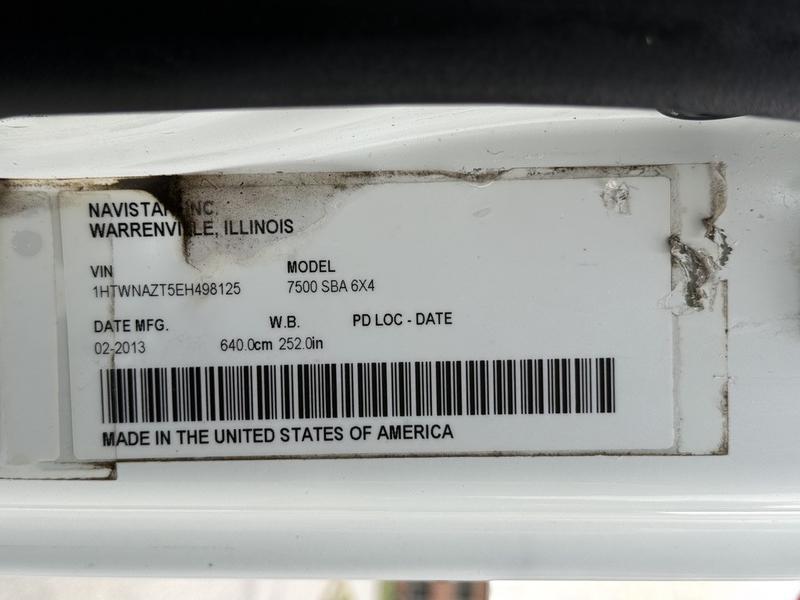 2014 International 7500 Vactor 2100 Series Vacuum Truck, powered by a 9.3L 6-cylinder diesel engine, automatic transmission, and 6x4 drivetrain. Outfitted with a Vactor 2100 Series vacuum system powered by a John Deere auxiliary engine (APU). Features include a water blast diagnostic panel, handgun pressure wand, Vactor thermoplastic components, rear signal arrow board, and multiple switch controls (strobe, off-road, fan overboard, master, and diff lock). Also includes storage compartments, cruise control, air brakes, AM/FM radio, and a grey cloth interior. GVWR rated at 26,308 KG (58,000 LB). Overall dimensions: 37'7" long × 8'9" wide × 11'2" high.