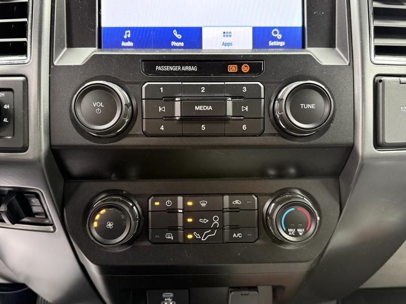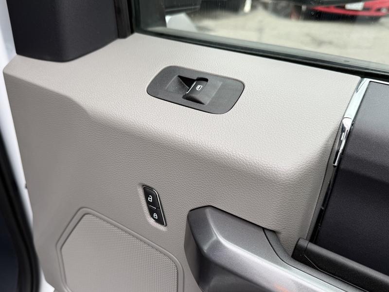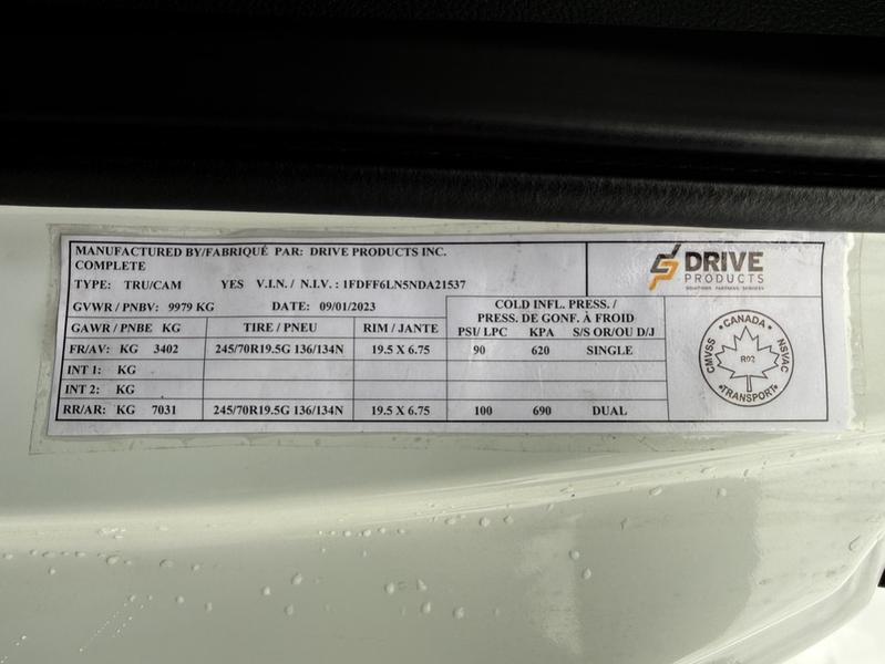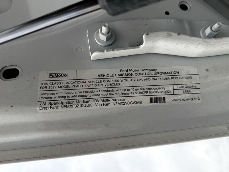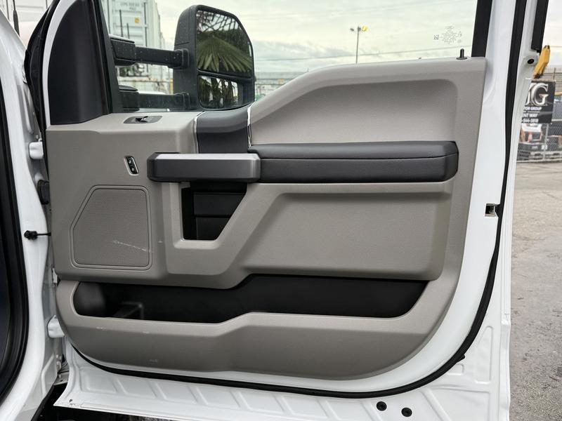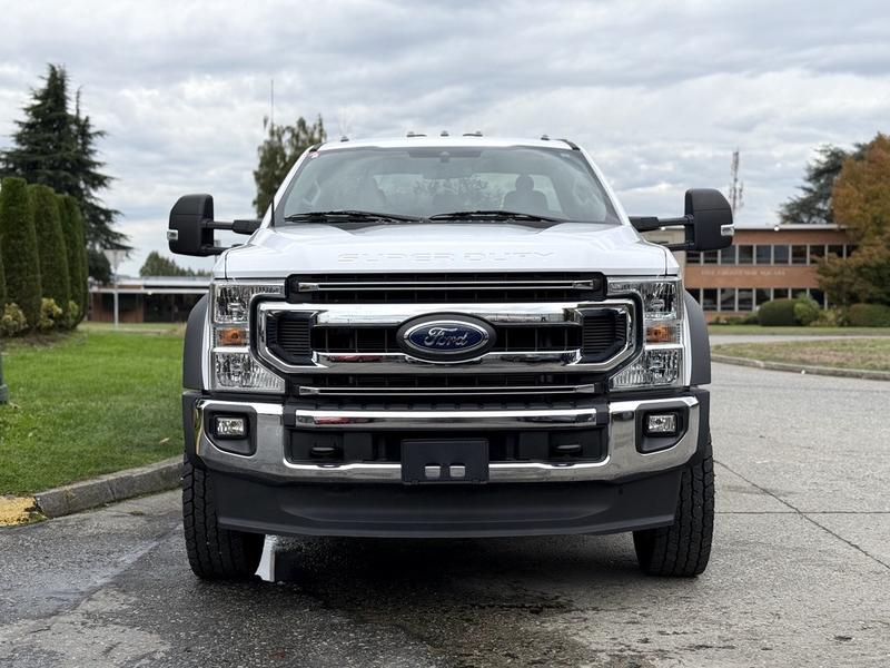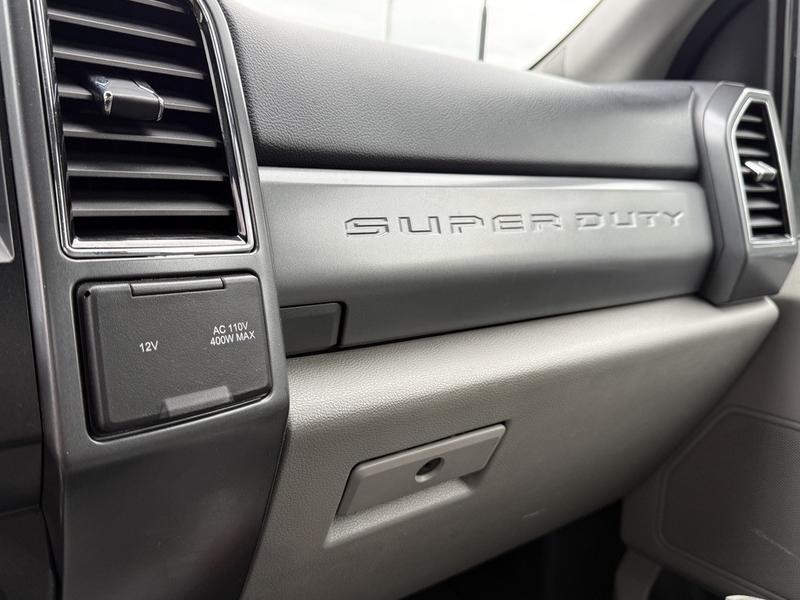 2022 Ford F-600 XLT 4x4 roll-off tow truck with 20-foot flat deck, powered by a 7.3L V8 gas engine paired with automatic transmission. Outfitted with an 8,000 lb winch, PTO, and roll-off functionality, making it suitable for equipment transport and recovery work. Features include backup camera, cruise control, air conditioning, AM/FM radio, USB and Type-C inputs, power windows, power locks, power mirrors, and 4x4 gear selector. White exterior with grey cloth interior. Built for heavy-duty performance with a GVWR of 9,979 kg (22,000 lb).