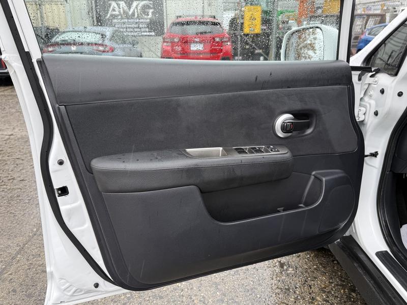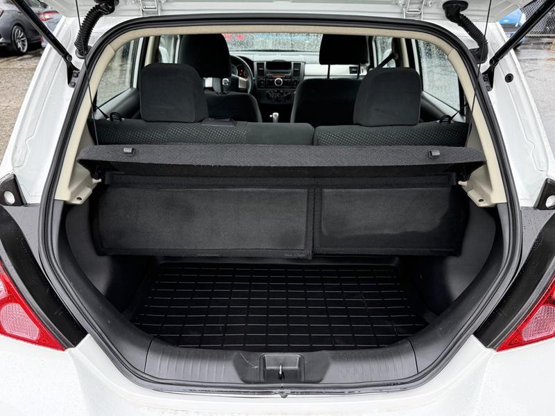 2012 Nissan Versa 1.8 S hatchback powered by a 1.8L 4-cylinder engine with automatic transmission and front-wheel drive. Features include air conditioning, AM/FM CD radio with AUX input, 12V power outlet, power windows, power door locks, and power mirrors. Comes finished in white with a grey cloth interior. Compact and efficient with practical hatchback utility.