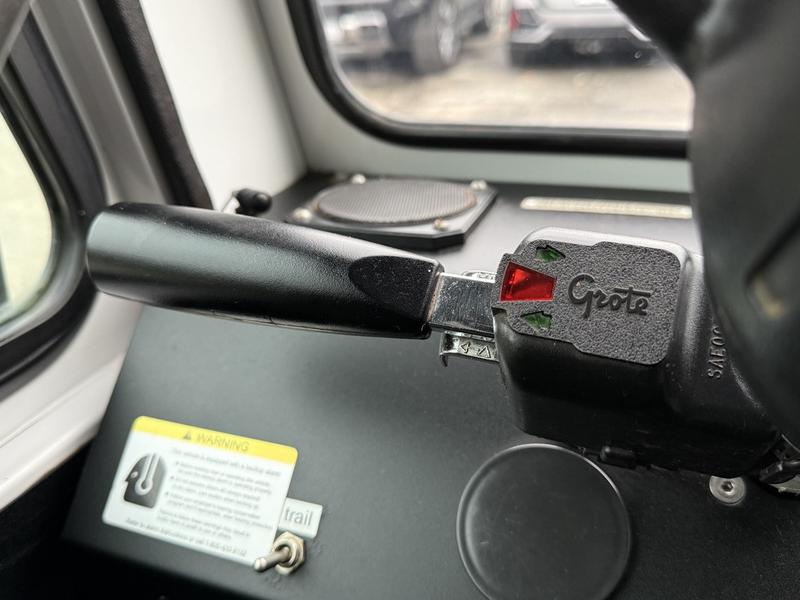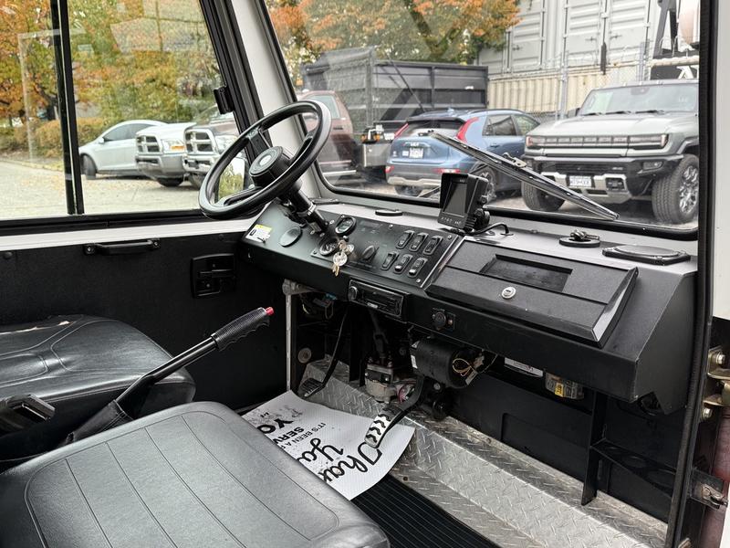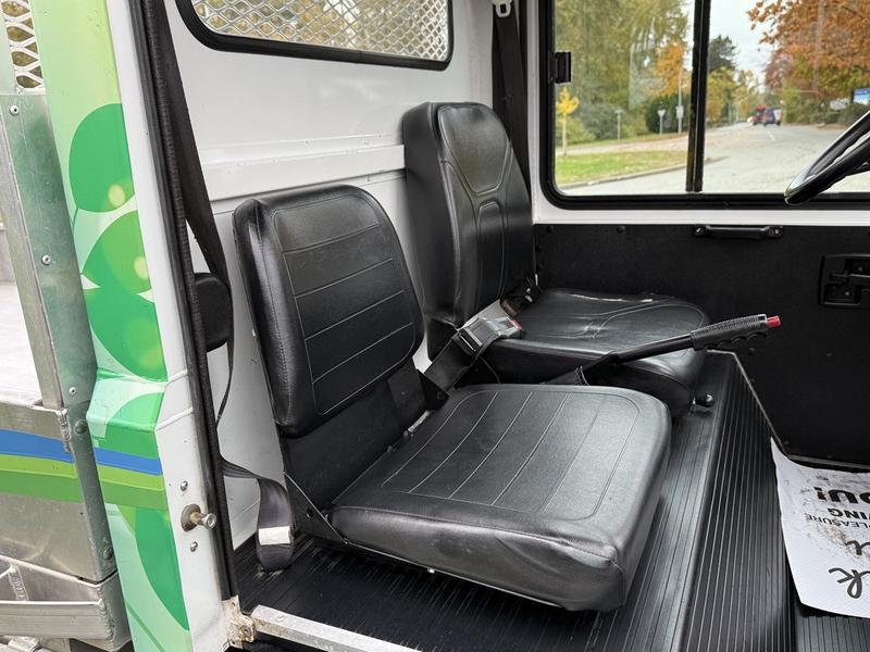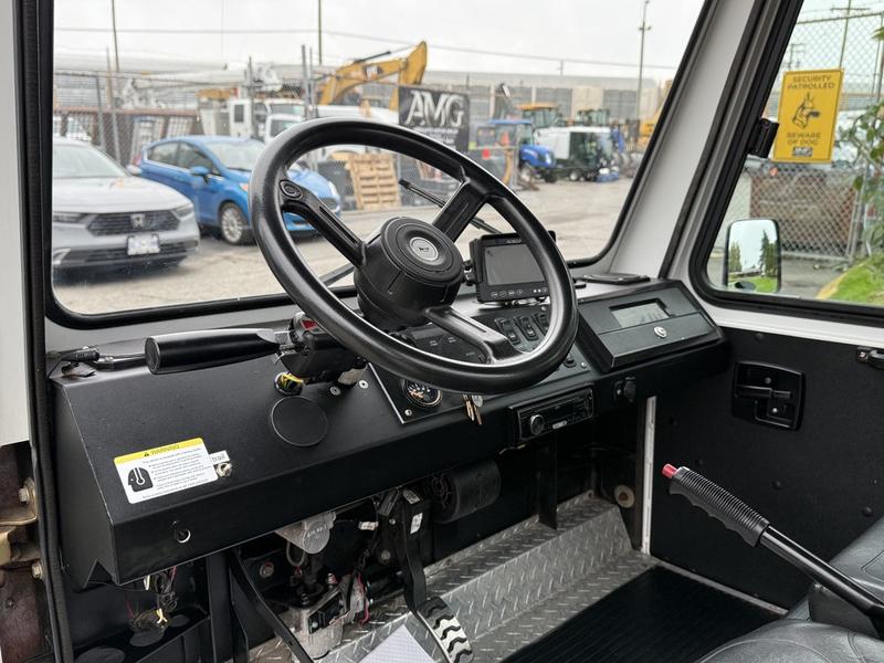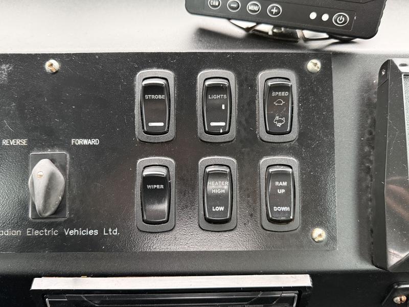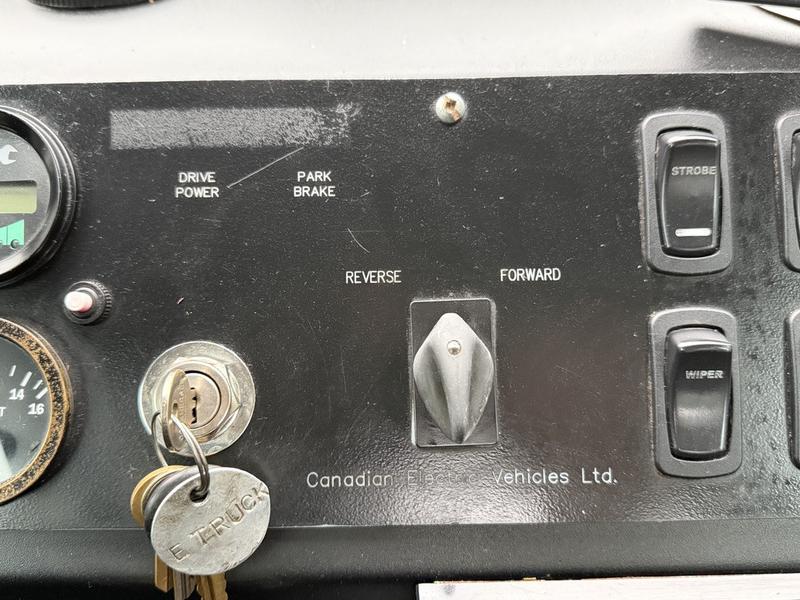 2019 CanEV Might-E electric dump truck with rear-wheel drive, automatic transmission, and compact 2-door cab. Designed for municipal, campus, and industrial use, this low-speed utility vehicle features a strobe light, reverse and forward switch, speed control, heater, reverse camera, and AM/FM radio. Dump bed measures 6'8" long and 4' wide. Overall vehicle dimensions: 11'4" long, 4'7" wide, and 6'7" high. White exterior, black vinyl interior. A practical and efficient choice for light-duty hauling in urban or off-street environments.