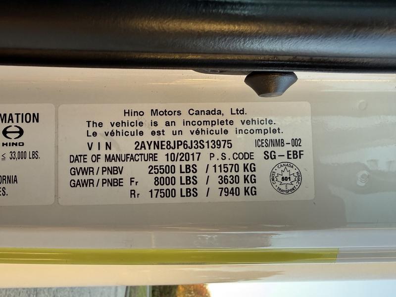 This 2018 Hino 268 cube van features an 18-foot cargo area with built-in shelving and a power lift gate rated at 3,500 lbs. Powered by a 7.6L diesel engine and equipped with hydraulic brakes, engine brake, air suspension, and rear-wheel drive, it offers a comfortable and capable setup for commercial hauling. Interior features include heated mirrors, cruise control, air conditioning, AM/FM radio, CD player, reverse camera, and a regen switch. The box measures 18' L x 7'8" W x 7'8" H, and the overall vehicle length is 29'1". GVWR is 11,570 kg (25,500 lbs).