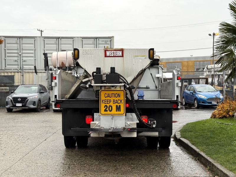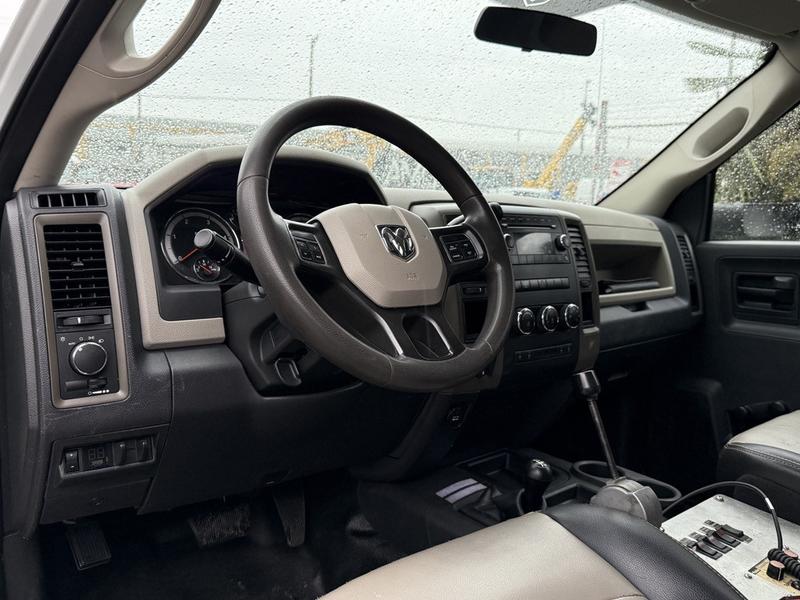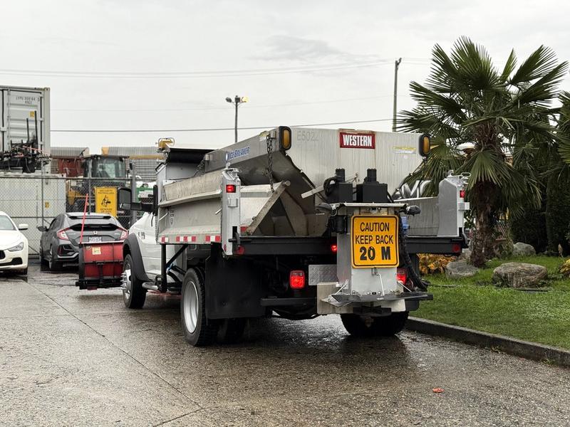 This 2012 Dodge Ram 5500 regular cab 4WD plow truck is equipped for demanding winter and job site conditions, featuring a Western contractor-grade plow, 9-foot dump box, and integrated sander. Powered by a 6.7L Cummins turbo diesel with automatic transmission and 4X4 capability, it includes a clutch pump, Parker Spread Master, spreader lights, beacon, and regen switch. The cabin offers cruise control, AM/FM radio, air conditioning, and manual controls. With a GVWR of 8,505 kg (18,750 lb) and overall length of 26 feet, this truck is ready for snow removal, municipal work, or commercial fleet use.