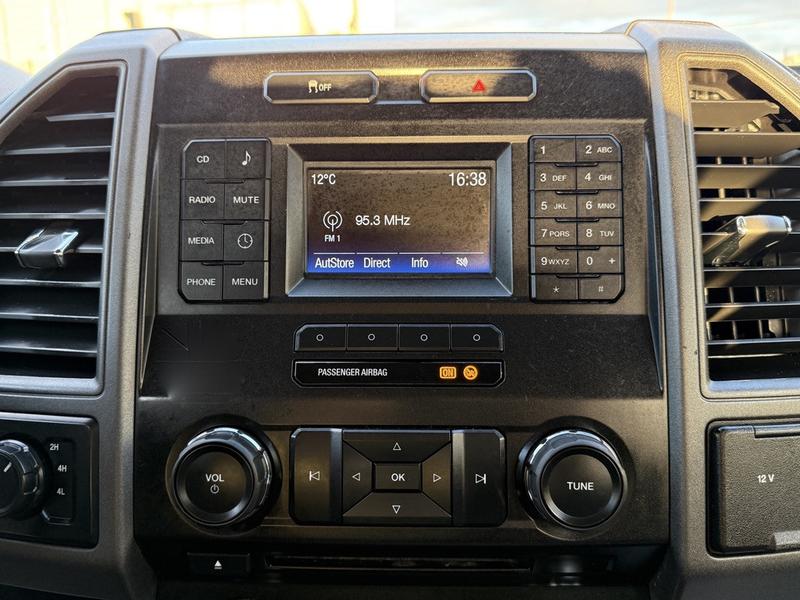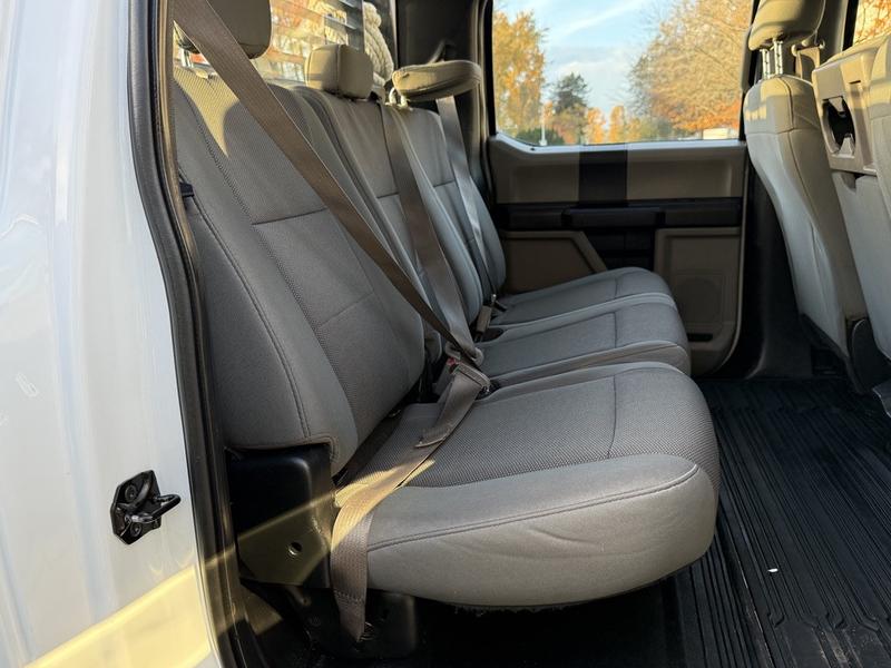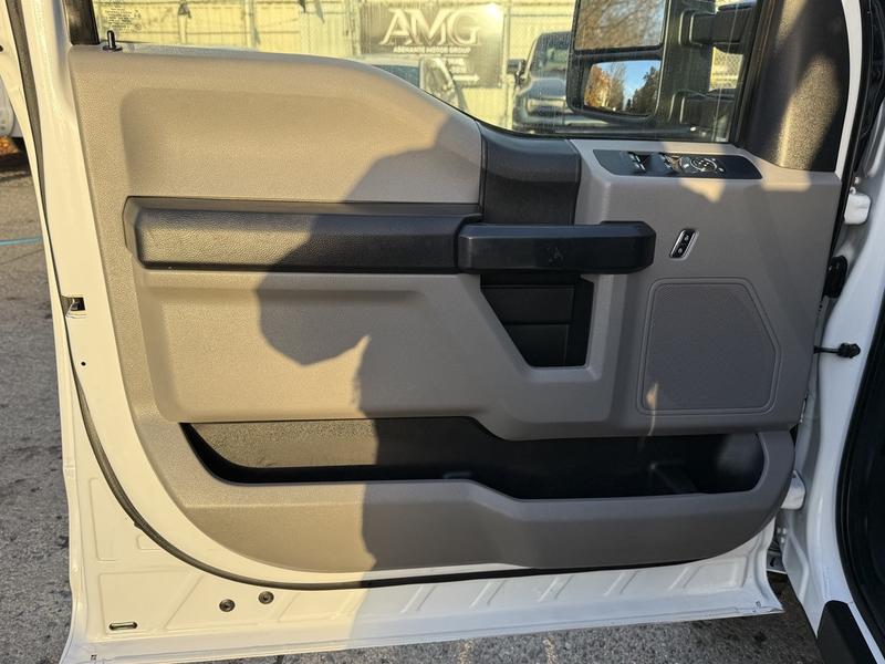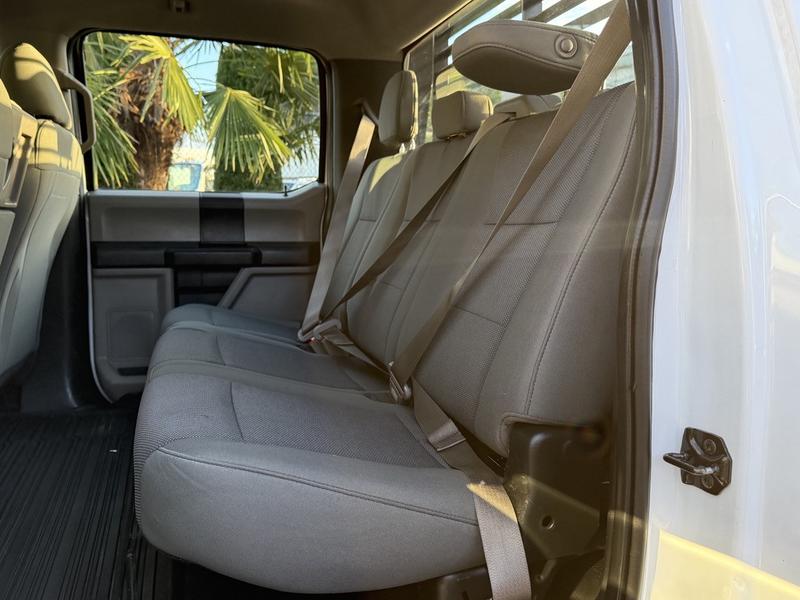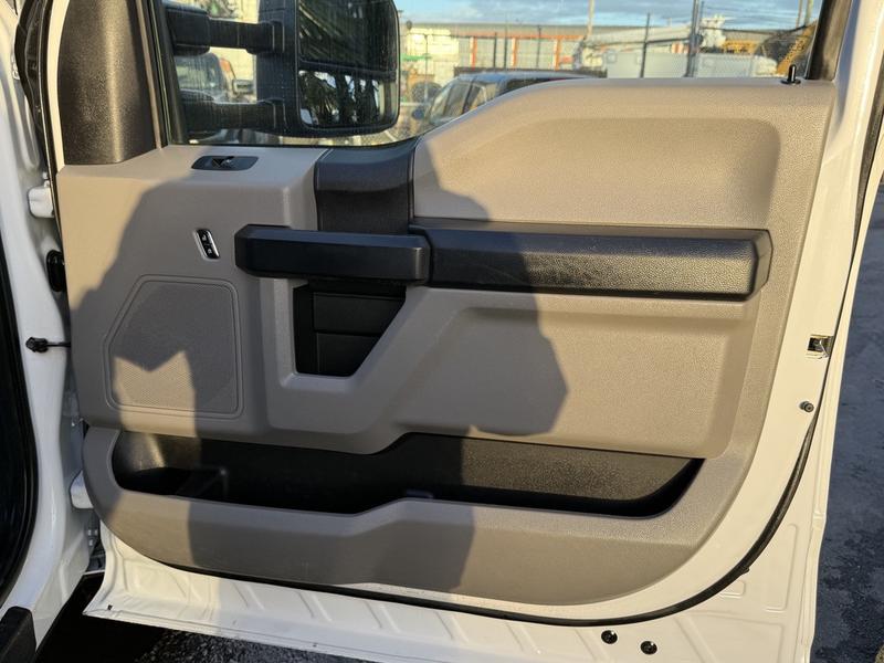 This 2018 Ford F-350 Super Duty XL 4×4 features a spacious crew cab and an 8-foot 8-inch flat deck, making it well-suited for job sites or hauling gear. Powered by a 6.2L V8 gas engine with automatic transmission and 4WD, it includes power windows, power locks, cruise control, USB input, and air conditioning. Finished in white over grey cloth interior. Overall measurements: 22'7" long × 7'9" wide × 7'3" high.