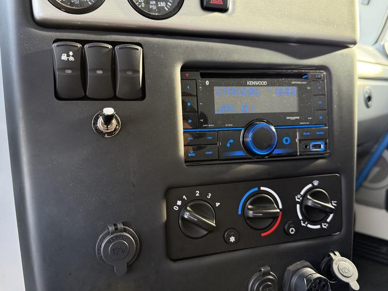 2022 Lion Lion6 electric cab and chassis featuring air brakes and powered by BMW batteries. This fully electric commercial platform has only 3,494 km and is equipped with cruise control, Webasto heater, power group, and AM/FM/CD radio. The GVWR is rated at 11,793 kg (26,000 lb), with a 12,500 lb front axle and 21,000 lb rear axle. Frame length from cab to end measures 25 ft 10 in, with a 16 ft 4 in cab-to-axle distance.