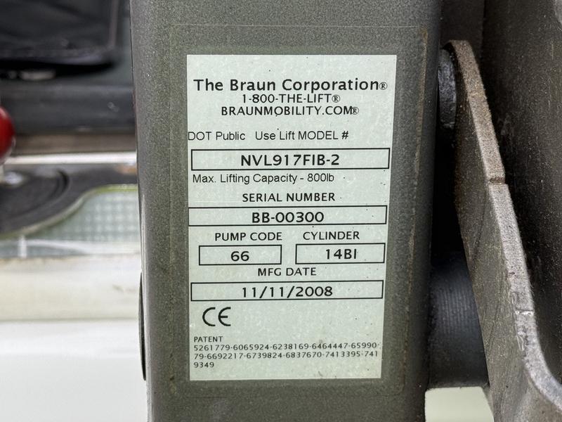 2009 Ford Econoline E-450 Super Duty diesel passenger bus with seating for 13 including the driver. Features a Braun wheelchair lift with an 800 lb capacity, automated passenger entry door, and rear Trans Air air conditioning. Powered by a 6.0L V8 diesel engine with automatic transmission and rear-wheel drive. Equipped with cruise control, AM/FM/CD radio, power body switch, and interior storage compartments. Measures 27 ft 7 in long and 9 ft 5 in high.