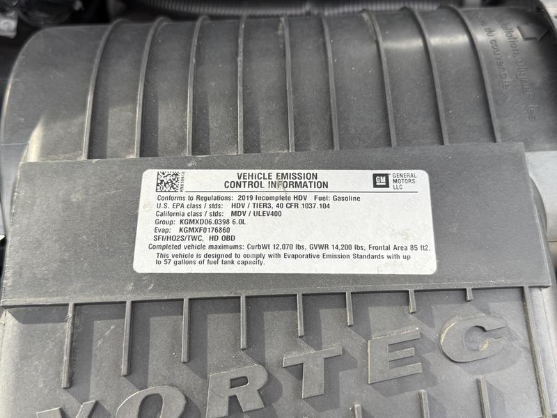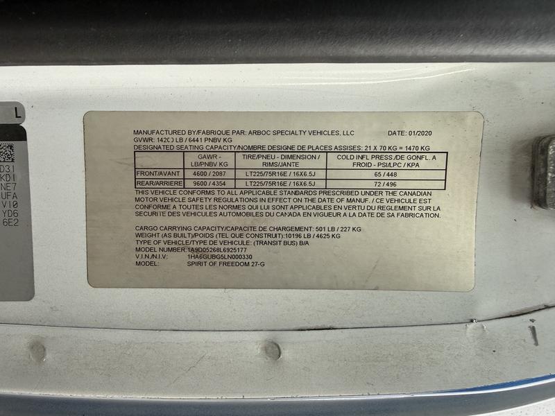 This 2020 Chevrolet Express 4500 22-passenger bus is equipped with a 6.0L 8-cylinder engine, automatic transmission, rear-wheel drive, cruise control, air conditioning and heat, AM/FM radio, and a vinyl blue interior with a grey exterior. It includes a wheelchair ramp, master body switch, cup holders and seating for 22 including the driver. The overall length is approximately 20 feet 3 inches, width 6 feet 5 inches and height 7 feet, with a GVWR of 6,441 kg (14,200 lb).
