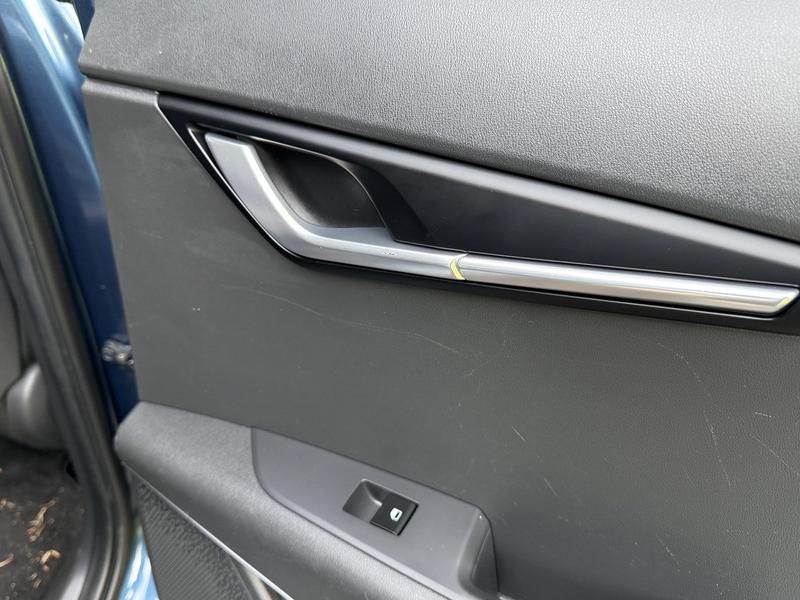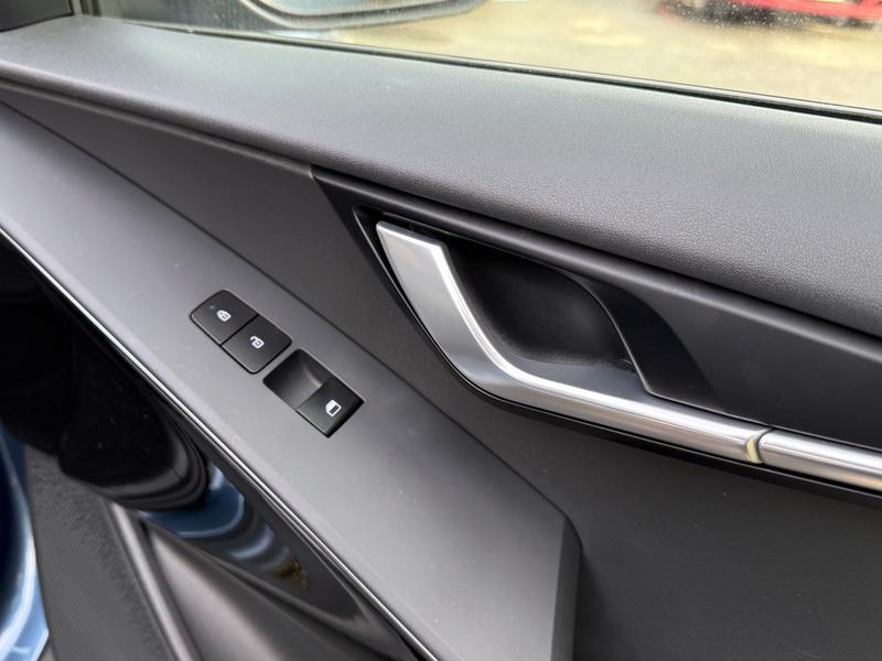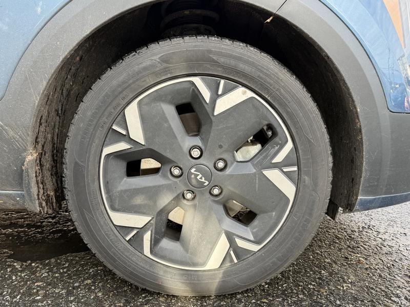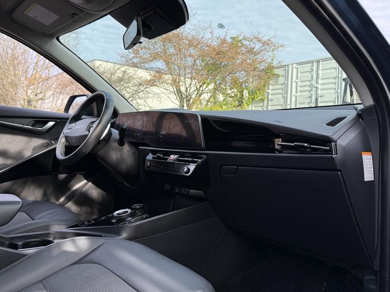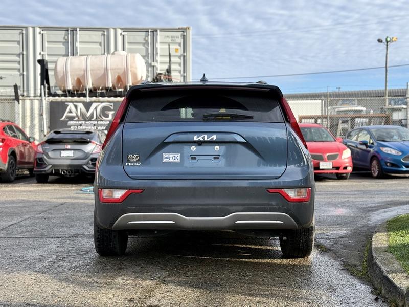 This 2023 Kia Niro EV Wind is equipped with an automatic transmission and front-wheel drive, and features a blue exterior with a black cloth interior. Equipment includes a touchscreen display, wireless phone charging pad, reverse camera, parking sensor, heated seats, heated steering wheel, dual climate zone, air conditioning and heat, 12V, USB and Type-C inputs, cruise control, brake hold, regen braking, lane assist, self-steering, drive mode selection, front collision warning and an emergency SOS function. The vehicle also has power seats, power windows, power door locks, power mirrors and a power trunk, along with an AM/FM radio.
