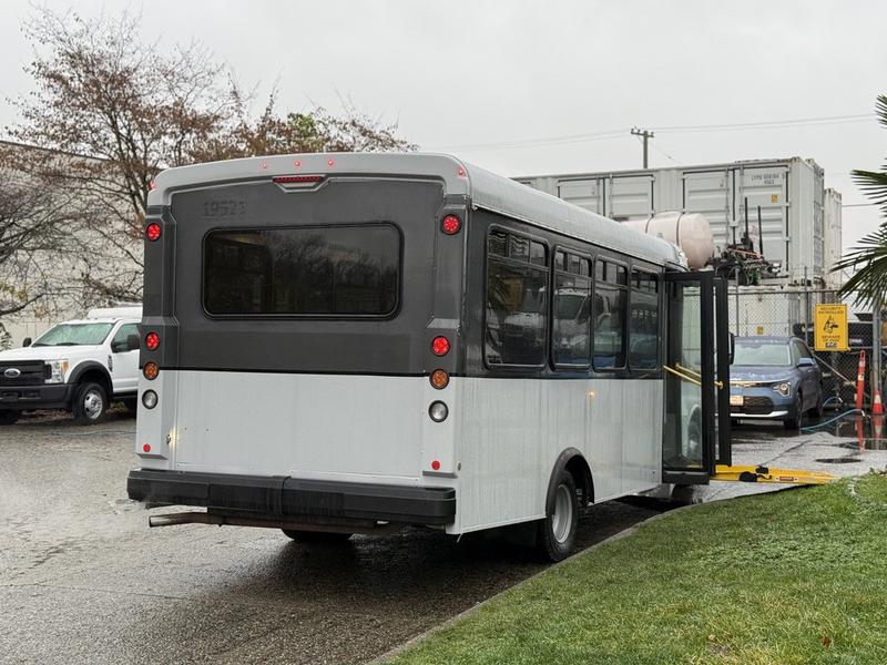 This 2019 Chevrolet Express 4500 22-passenger bus is equipped with a 6.0L 8-cylinder engine, automatic transmission and rear-wheel drive, and features a grey exterior with a blue vinyl interior. It includes seating for 22 including the driver, a wheelchair ramp, master body switch, cruise control, air conditioning and heat, cup holders and an AM/FM radio. The bus measures approximately 20 feet 3 inches long, 6 feet 5 inches wide and 7 feet high, with a GVWR of 6,441 kg (14,200 lb).