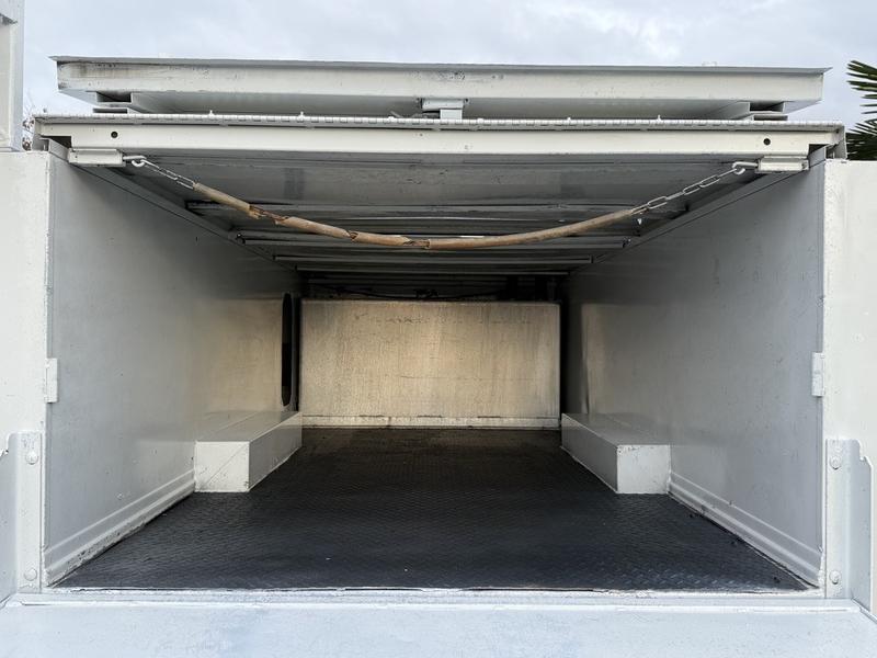 This 2013 Ram 3500 crew cab 4x4 DRW service truck is equipped with a 5.7L 8-cylinder engine, automatic transmission and four-wheel drive, and features a white exterior with a grey cloth interior. It includes storage compartments, a beacon light, 4x4 gear selector, tow/haul mode, auxiliary switches, cup holders, 12V inputs, air conditioning and heat, and an AM/FM radio, along with power windows, power door locks and power mirrors. The rear service box area measures approximately 7 feet 5 inches long, 4 feet 5 inches wide and 2 feet 7 inches high. Overall vehicle dimensions are about 23 feet 1 inch long, 8 feet 1 inch wide and 7 feet 3 inches high, with a GVWR of 5,670 kg (12,500 lb).