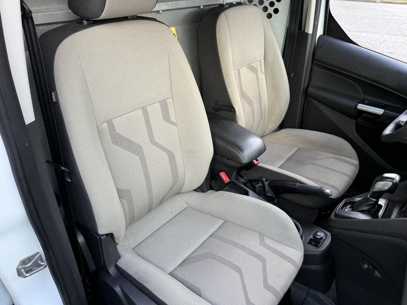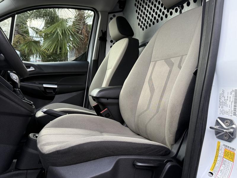 This 2017 Ford Transit Connect XLT cargo van is equipped with a 2.5L 4-cylinder engine, automatic transmission and front-wheel drive, and features a white exterior with a grey cloth interior. It includes rear work shelves, a wave inverter with power outlets, cargo lock, heated mirrors, a storage compartment, cruise control, air conditioning and heat, and an AM/FM radio with Bluetooth and CD player, along with power windows, power door locks and power mirrors. The van measures approximately 15 feet 9 inches long, 7 feet wide with mirrors and 6 feet 5 inches high.