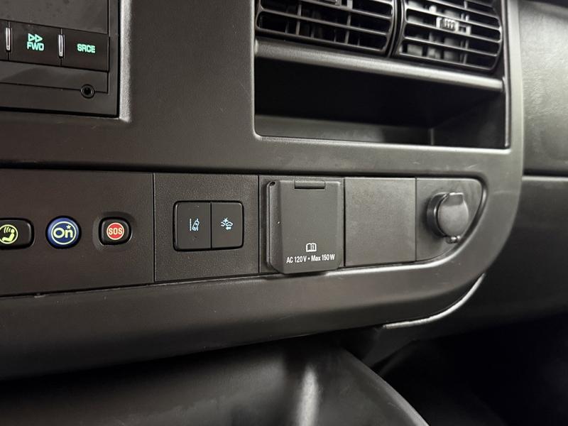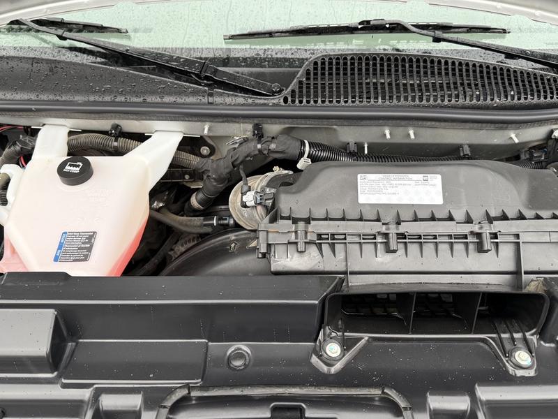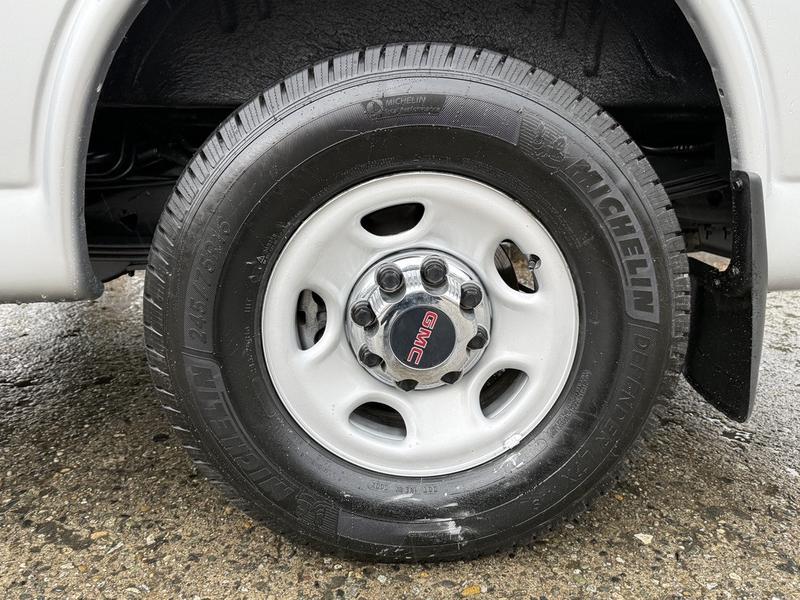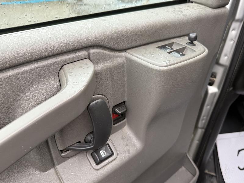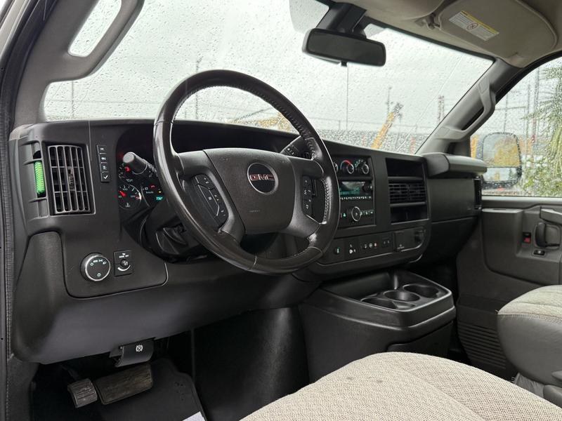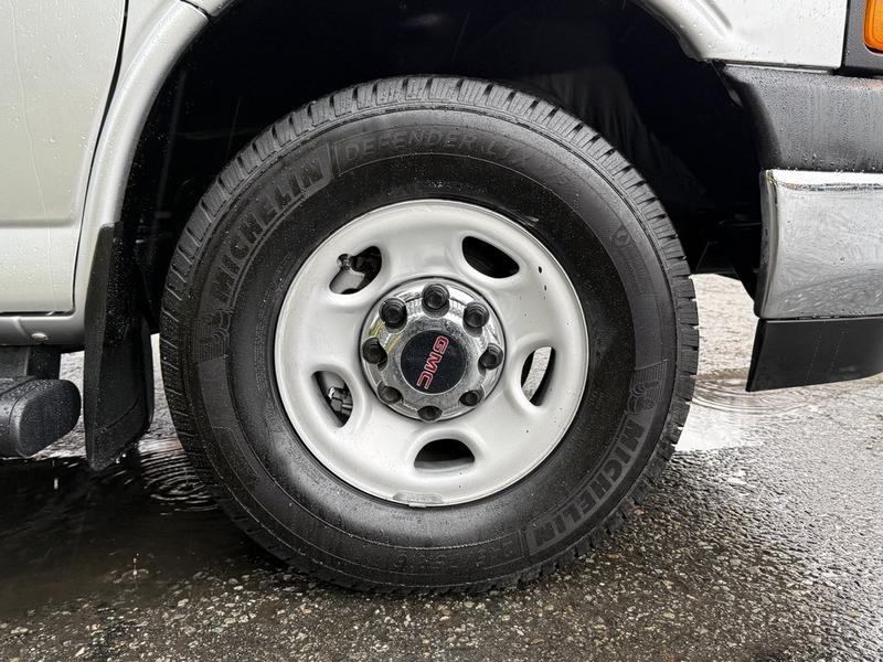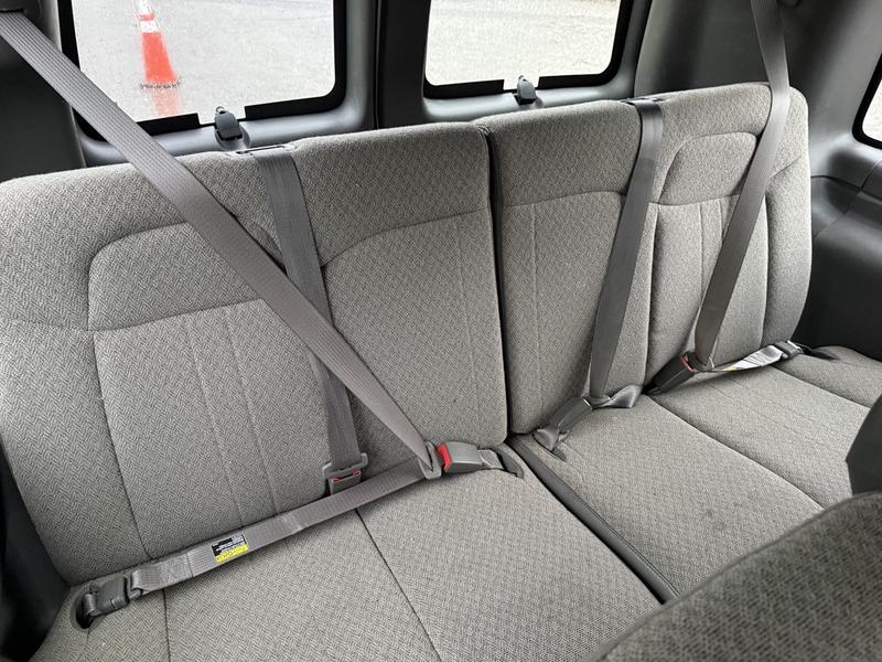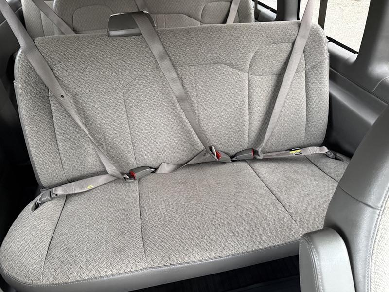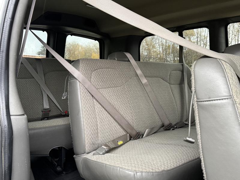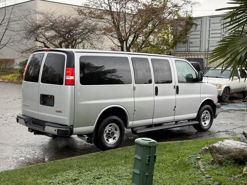 This 2023 GMC Savana 2500 LT 12-passenger van is equipped with a 4.3L 6-cylinder engine, automatic transmission and rear-wheel drive, and features a silver exterior with a grey cloth interior. It includes seating for 12 including the driver, front and rear air conditioning and heat, lane assist, heated mirrors, reverse camera, tow package, rear cup holders, cruise control, 12V input and an AM/FM radio, along with power windows, power door locks and power mirrors. The van measures approximately 18 feet 6 inches long, 6 feet 6 inches wide and 7 feet high.