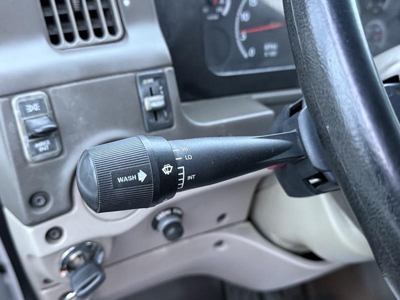 This 2004 Sterling LT9500 flat deck truck with National Crane is equipped with a 12.8L 6-cylinder MBE4000 engine, automatic transmission and 6x4 driveline, and features a white exterior with a tan vinyl interior. The National Crane 600D (Serial No. 290504) provides a boom height of approximately 25 feet and a maximum pull rating between 7,700 lb and 36,000 lb, and includes dual control panels and a Cranesmart system. Additional equipment includes air brakes, PTO, engine brake switch, axle lock switch, heated mirrors, manual windows, storage compartments, cruise control, air conditioning and heat, and an AM/FM radio. The flat deck measures about 17 feet long and 8 feet 6 inches wide. Overall vehicle dimensions are approximately 35 feet 2 inches long, 13 feet 6 inches high and 8 feet 6 inches wide, with a GVWR of 29,937 kg (66,000 lb).