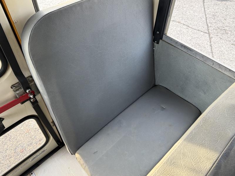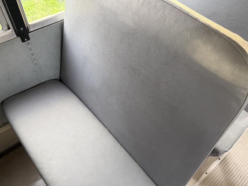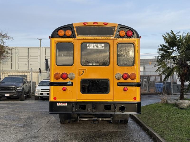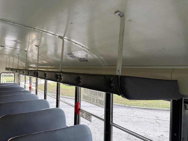 This 2013 International 4300 35-passenger school bus is equipped with a 6.4L 8-cylinder diesel engine, automatic transmission and rear-wheel drive, and features a yellow exterior with a grey vinyl interior. It includes seating for 35 including the driver, hydraulic brakes, an automatic opening passenger door, emergency shut-down switch, air conditioning and heat, and an AM/FM radio. The bus measures approximately 32 feet 1 inch long, 8 feet 2 inches wide and 10 feet 2 inches high.