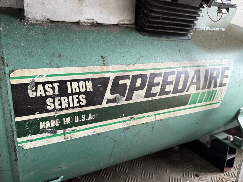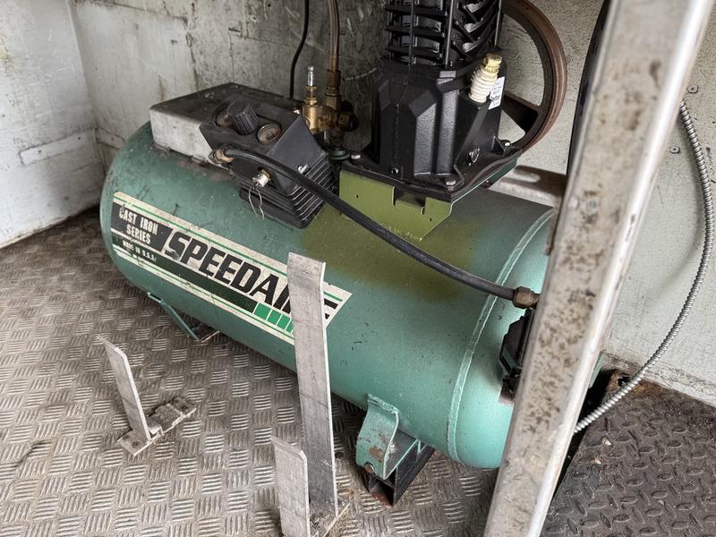 This 2007 Ford E-350 Super Duty diesel 10-foot cube van is equipped with a 6.0L 8-cylinder engine, automatic transmission and rear-wheel drive, and features a white exterior with a grey vinyl interior. It includes rear work shelving, a Cast Iron Series Speedaire compressor, storage compartments, power outlets, manual windows and door locks, cup holders, reverse camera and an AM/FM radio. The cube interior measures approximately 10 feet long, 7 feet 8 inches wide and 6 feet 8 inches high. Overall vehicle dimensions are about 19 feet 2 inches long, 7 feet 11 inches wide and 9 feet 4 inches high, with a GVWR of 5,216 kg (11,500 lb).