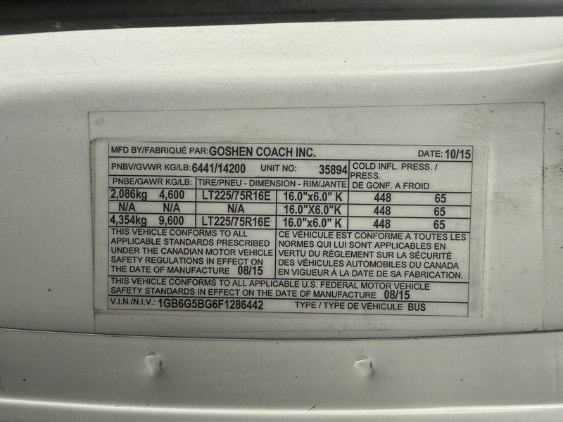 This 2015 Chevrolet Express 4500 11-passenger bus is equipped with a 6.0L 8-cylinder engine, automatic transmission and rear-wheel drive, and features a white exterior with a blue cloth interior. It includes seating for 11 including the driver, a Ricon wheelchair lift with an 800 lb (364 kg) capacity, front and rear air conditioning and heat, 12V input, cruise control and an emergency exit. The bus measures approximately 24 feet 11 inches long, 8 feet 2 inches wide and 9 feet 8 inches high, with a GVWR of 6,441 kg (14,200 lb).