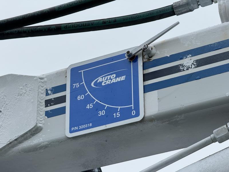 This 2006 Ford F-450 SuperCab 4x4 DRW XLT Super Duty service truck is equipped with a 6.0L 8-cylinder engine, manual transmission and four-wheel drive, and features a grey exterior with a grey cloth interior. It includes a service box with storage compartments and an Auto Crane offering 360-degree rotation, a 3,200 lb lifting capacity, hydraulic power extension to approximately 11 feet 4 inches and manual extension to about 15 feet 4 inches. Additional equipment includes a Honda GX390 generator, 4x4 gear selector, cruise control, air conditioning and heat, and an AM/FM radio with CD player, along with power windows, power door locks and power mirrors. The truck measures roughly 21 feet 3 inches long, 7 feet 8 inches wide and 9 feet 5 inches high, with a GVWR of 7,257 kg (16,000 lb).