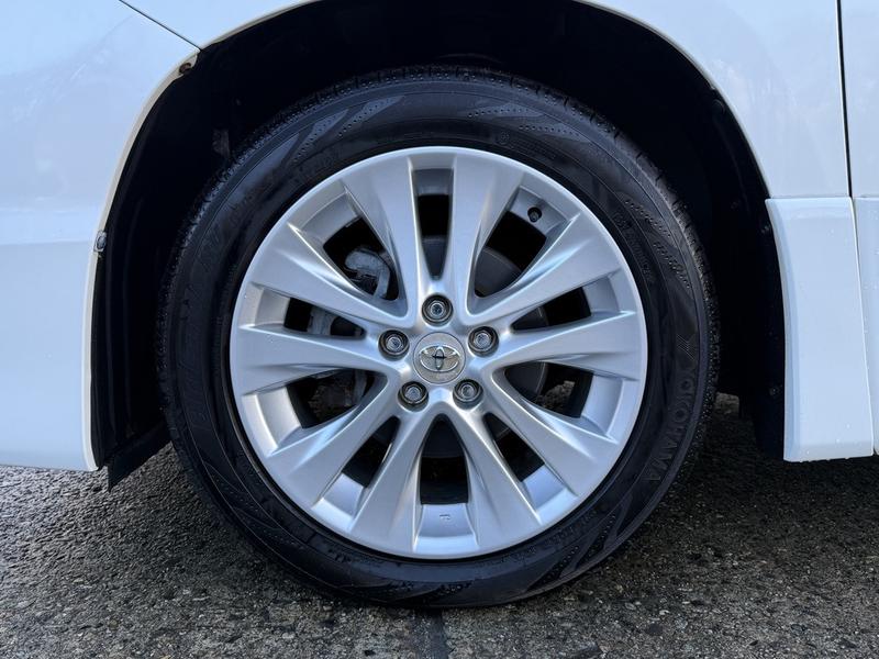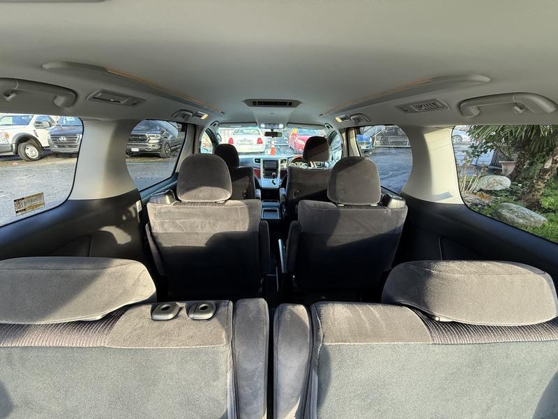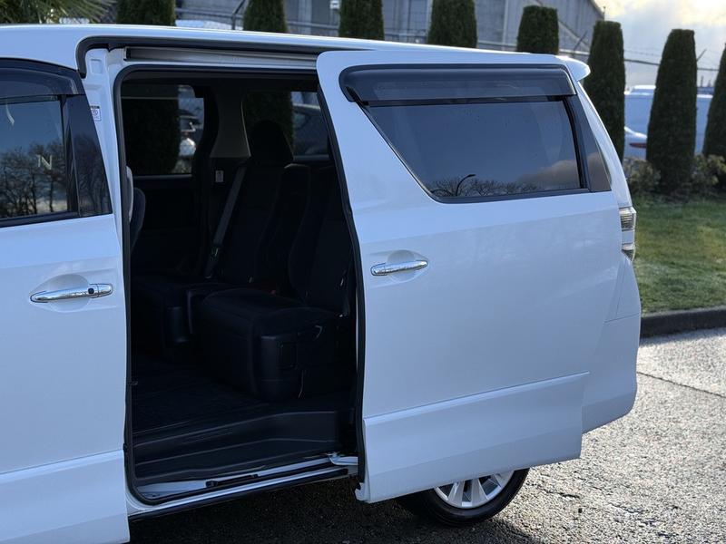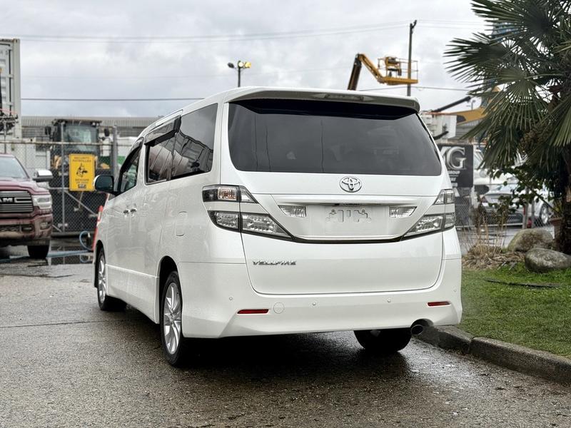 This 2009 Toyota Vellfire 2.4 AWD is a right-hand-drive Japanese import equipped with a 2.4L 4-cylinder engine, automatic transmission and all-wheel drive, and features a white exterior with a black cloth interior. It includes seating for six, power sliding door, leg rest extensions, rear air conditioning, backup camera, air conditioning and heat, AM/FM radio, and power windows, power door locks and power mirrors. The vehicle measures approximately 15 feet 10 inches long, 6 feet 1 inch wide and 6 feet 4 inches high. This unit has passed BC inspections.