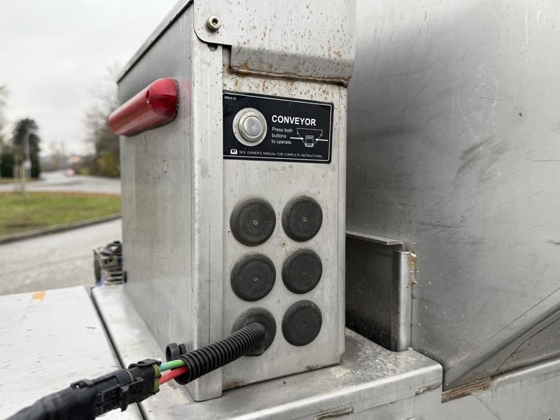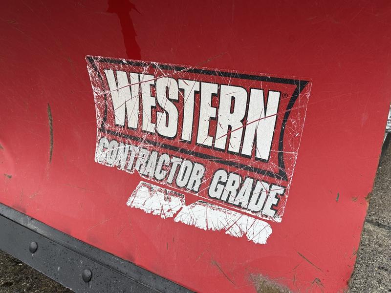 This 2021 Ford F-600 XLT Super Duty 4x4 diesel plow truck is equipped with a 6.7L 8-cylinder engine, automatic transmission and four-wheel drive, and features a white exterior with a grey cloth interior. It includes a Western snow plow measuring approximately 9 feet 6 inches wide and 3 feet 2 inches high, a Western Striker sander and a Voth dump box with interior measurements of about 11 feet 6 inches long and 7 feet 6 inches wide. Additional features include a dump hoist controller, plow controller, plow lights, retractable scoop, 4x4 gear selector, reverse camera, cruise control, air conditioning and heat, Bluetooth and AM/FM radio, and power windows, power door locks and power mirrors. The truck measures roughly 28 feet 10 inches long, 9 feet 6 inches wide and 7 feet 10 inches high, with a GVWR of 9,979 kg (22,000 lb).