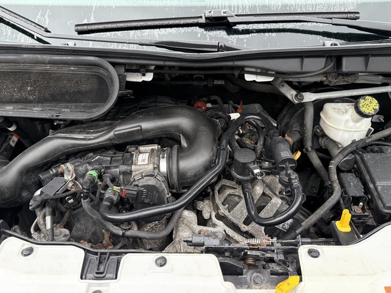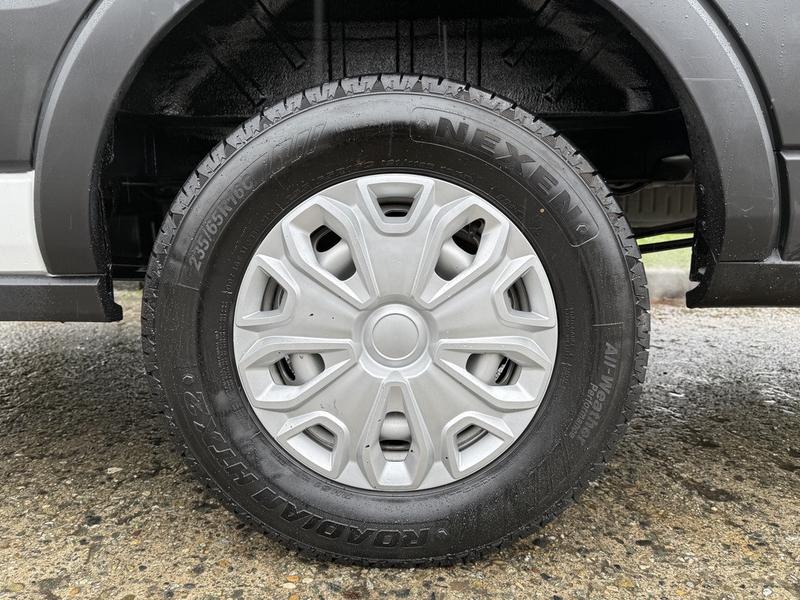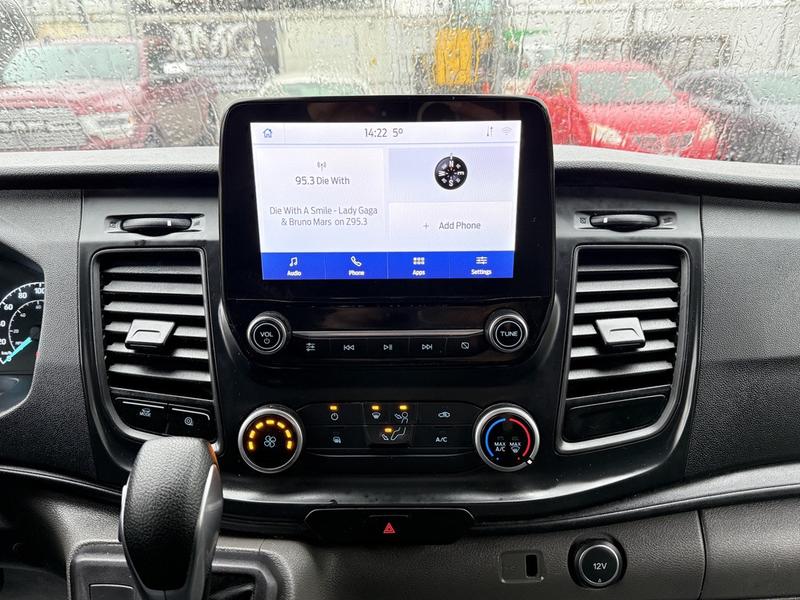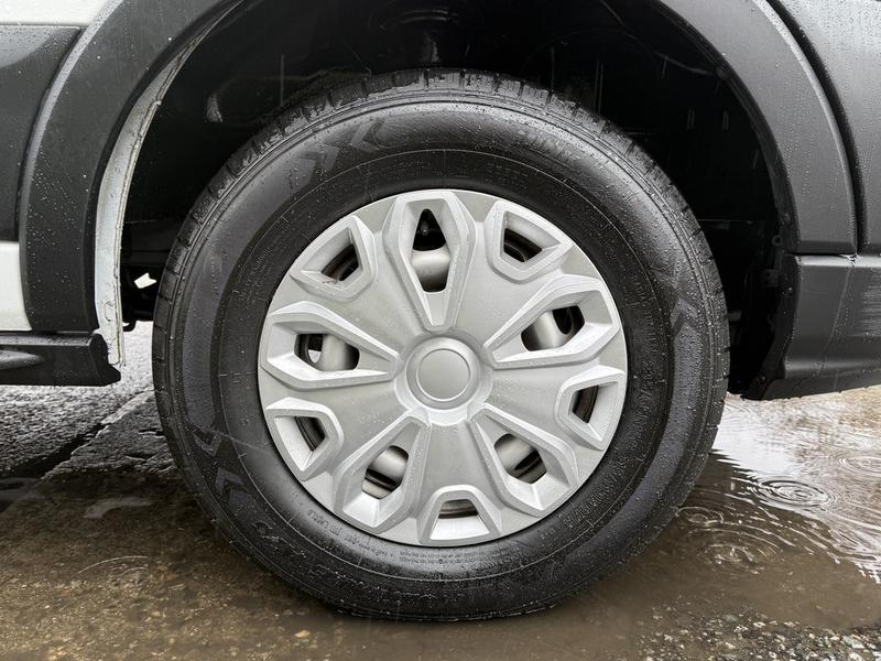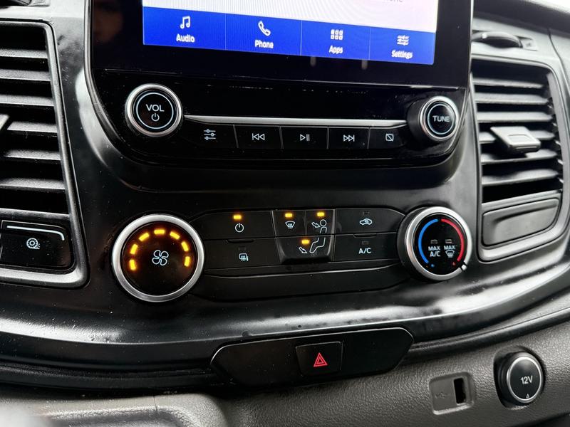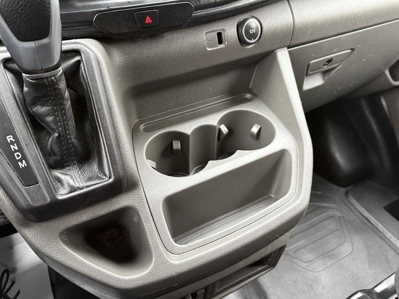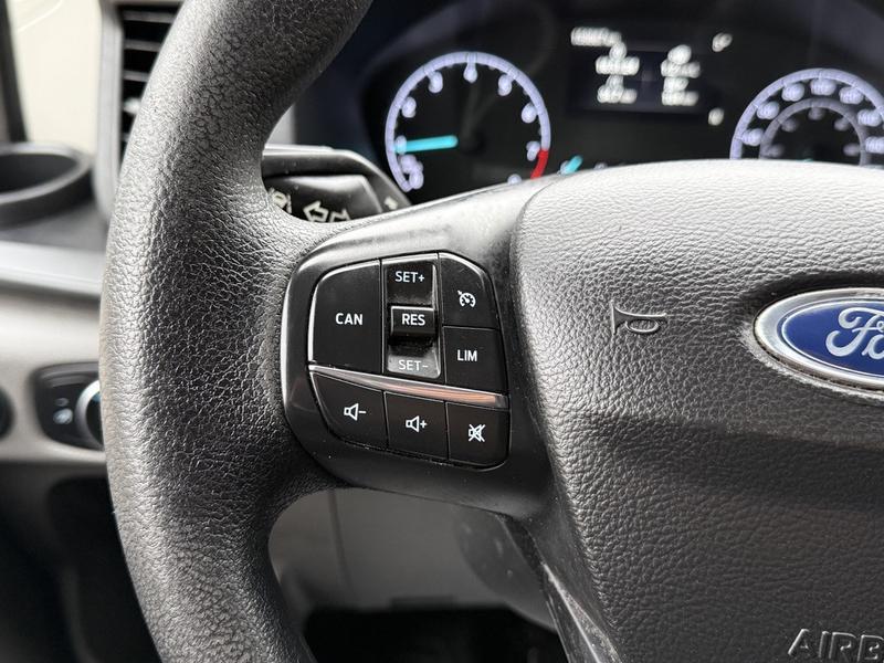 This 2020 Ford Transit 350 high roof extended length cargo van is equipped with a 3.5L 6-cylinder engine, automatic transmission and rear-wheel drive, and features a white exterior with a black cloth interior. Equipment includes a reverse camera, lane assist, cruise control, 12V input, cup holder, air conditioning and heat, and an AM/FM radio, along with power windows, power door locks and power mirrors. The van measures approximately 19 feet 6 inches long, 6 feet 7 inches wide and 9 feet 1 inch high.
