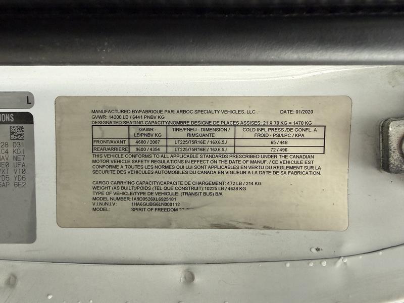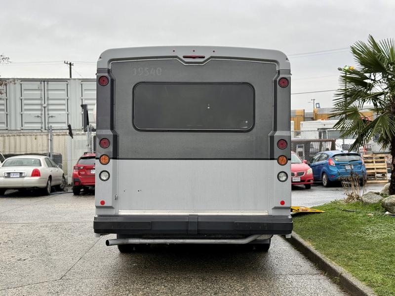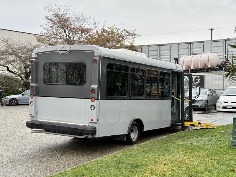 This 2020 Chevrolet Express 4500 22-passenger bus comes equipped with a wheelchair ramp and accessible interior layout, powered by a 6.0L 8-cylinder engine with an automatic transmission and rear-wheel drive. It features front and rear air conditioning and heat, an AM/FM radio, cruise control, master body switch, cup holders, and durable vinyl seating. The bus measures 20 feet 3 inches long, 6 feet 5 inches wide, and 7 feet high, with a GVWR of 6,441 kg (14,200 lb). Finished in grey with a blue interior, this unit is suitable for shuttle operations, group transportation, and accessibility-focused services.