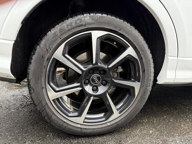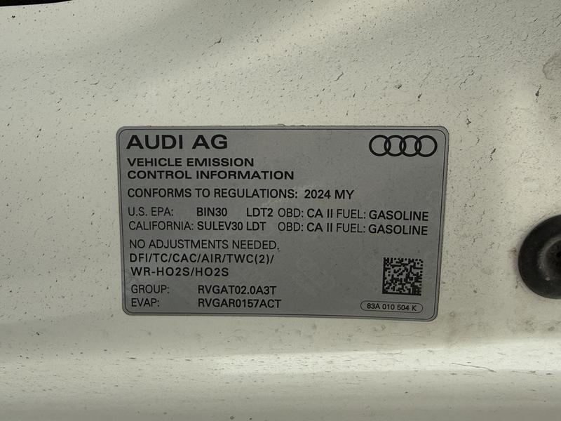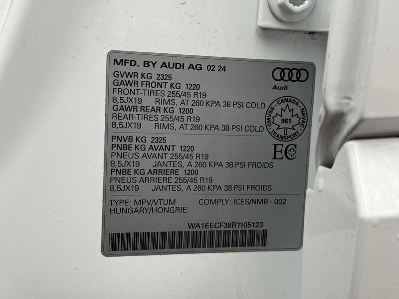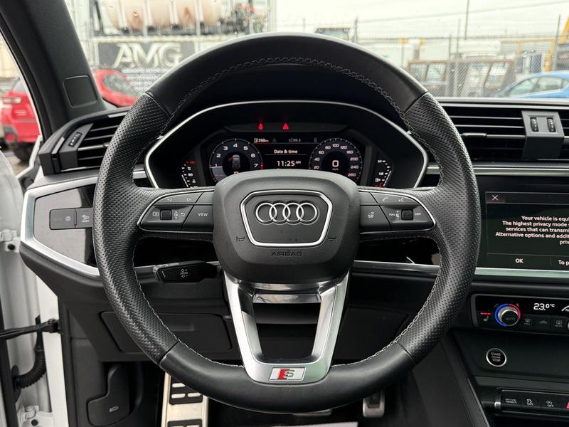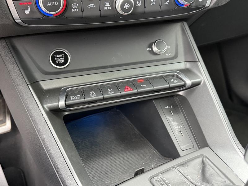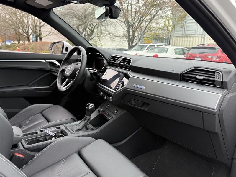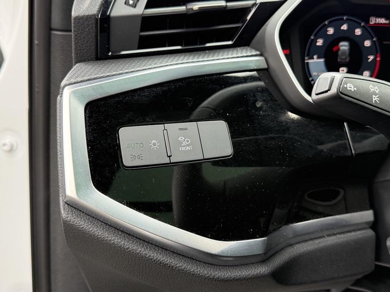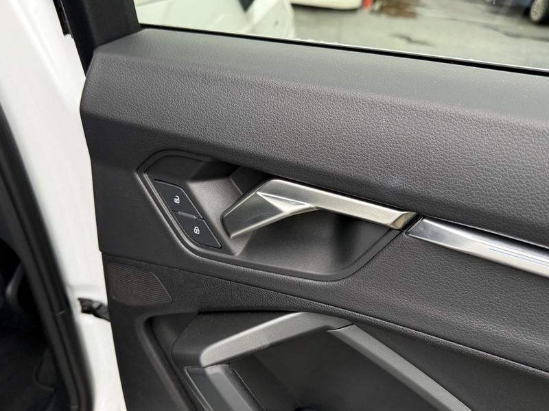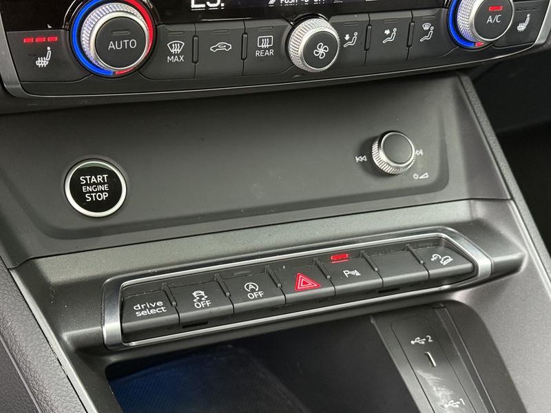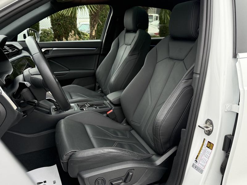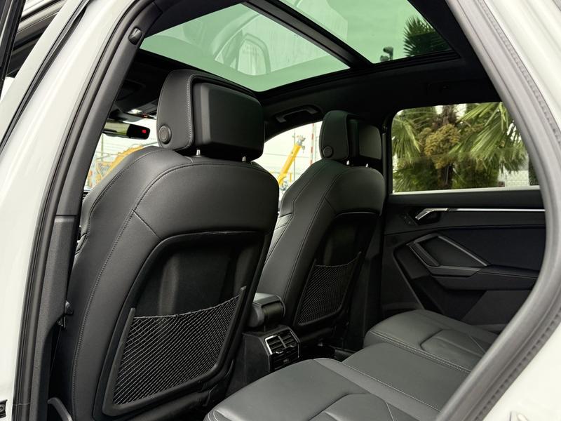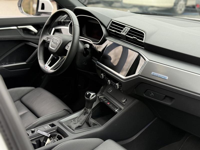 This 2024 Audi Q3 S Line Quattro Premium AWD features a 2.0L 4-cylinder engine, automatic transmission, and Audi’s Quattro all-wheel-drive system. Finished in white with a black leather interior, it includes a power moonroof, heated seats, heated steering wheel, drive modes (Off-Road, Comfort, Auto, Sport), and adjustable ride suspension. Convenience and tech features include an AM/FM radio with Bluetooth hands-free capability, backup camera, front and rear parking sensors, engine auto stop-start, emergency SOS switch, USB-C inputs, power windows, mirrors, door locks, and power seats. Additional equipment includes cruise control, air conditioning and heat, and a power child lock. The Audi measures 14 feet 7 inches long, 6 feet wide, and 5 feet 2 inches high.