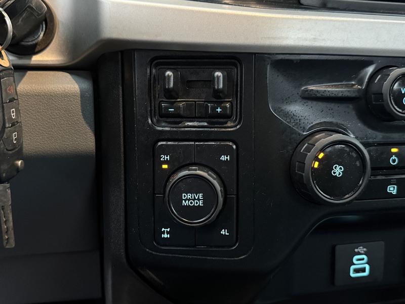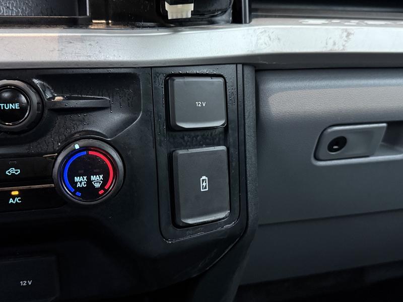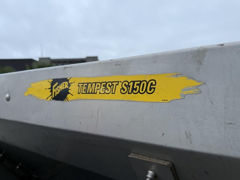 This 2023 Ford F-250 XL 4x4 plow truck is powered by a 6.8L 8-cylinder engine paired with an automatic transmission and four-wheel drive, and features a white exterior with a grey cloth interior. It is equipped with a Fisher front plow measuring approximately 7 feet 6 inches wide with plow lights and remote control, along with a Fisher Tempest S150C rear sander operated via an in-cab control panel. Additional features include a 4x4 gear selector, rear differential lock, trailer brake, auxiliary switches, cruise control, air conditioning and heat, AM/FM radio with Bluetooth, USB-C, USB and 12V inputs, and power windows, power door locks and power mirrors. Overall vehicle dimensions are approximately 23 feet 4 inches long, 7 feet 6 inches wide and 6 feet 7 inches high, making this truck well suited for winter maintenance, municipal, and contractor operations.