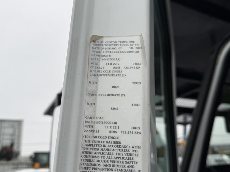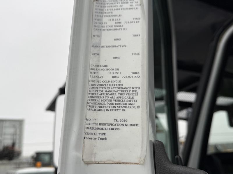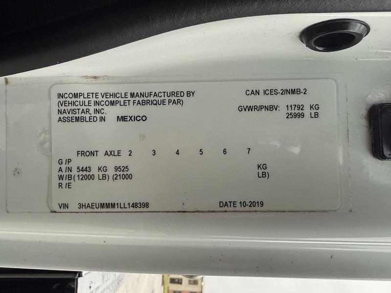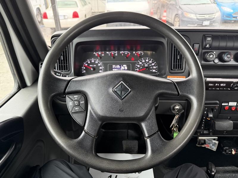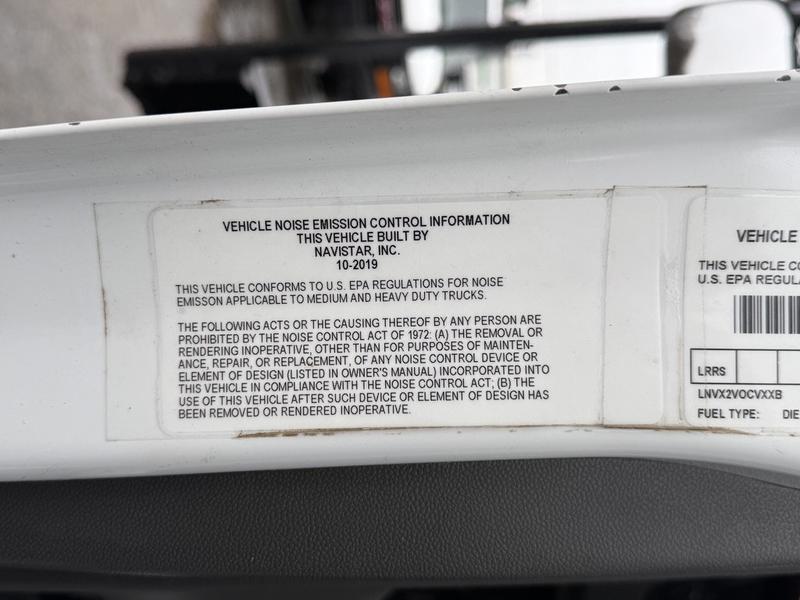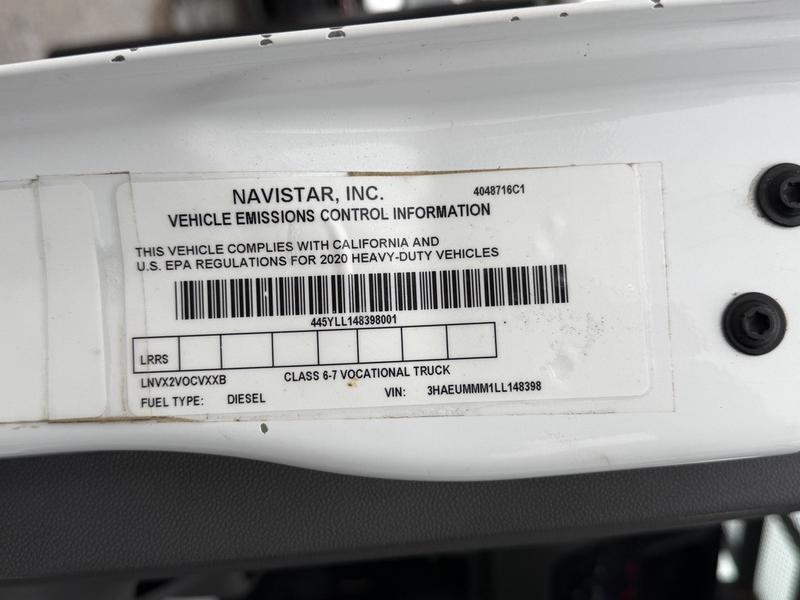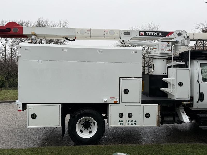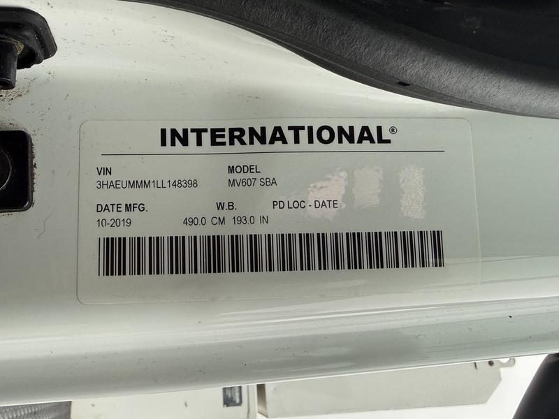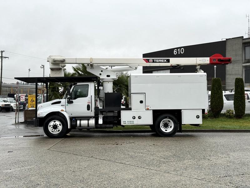 This 2020 International MV607 Cummins Terex bucket truck with dumping service body is powered by a 6.7L Cummins diesel engine paired with an automatic transmission and rear-wheel drive. It is equipped with a Terex XT PRO 56 aerial lift offering a 56-foot platform height and a 400 lb rated capacity, making it well suited for utility, electrical, municipal, and maintenance applications. The enclosed service body includes multiple storage compartments, PTO-driven hydraulics, outriggers with slope indicators, and boom control systems, along with a hydraulic dump function designed to unload material from the rear body. Additional features include hydraulic brakes, strobe lights, air conditioning and heat, cruise control, AM/FM radio, USB and 12V inputs, and cup holders. Finished in white with a grey cloth interior, this MV607 has an overall length of 32 feet 1 inch, a width of 8 feet 4 inches, a height of 12 feet 4 inches, and a GVWR of 11,792 kg (25,999 lb).
