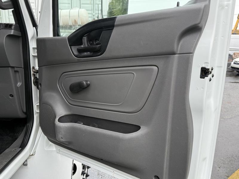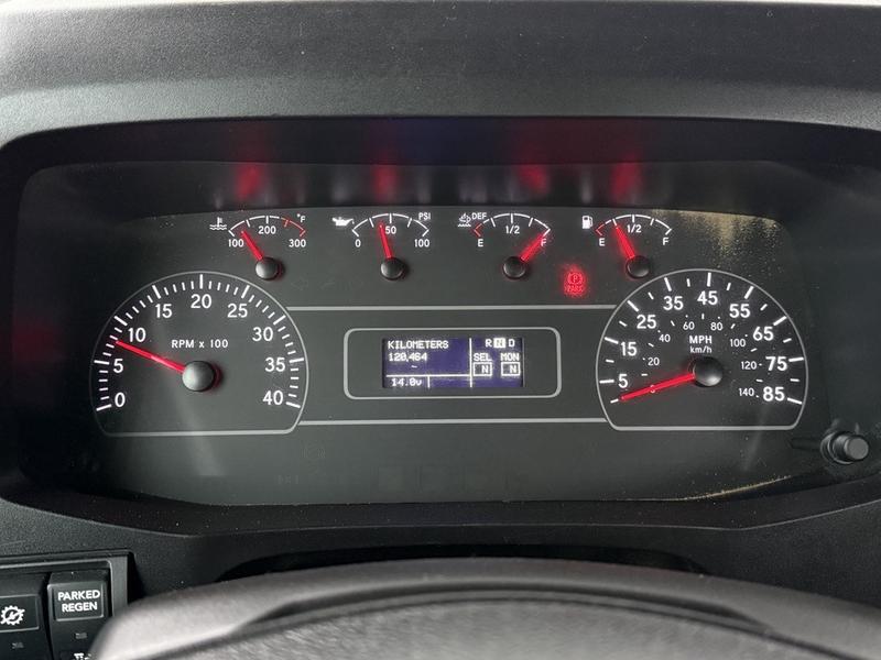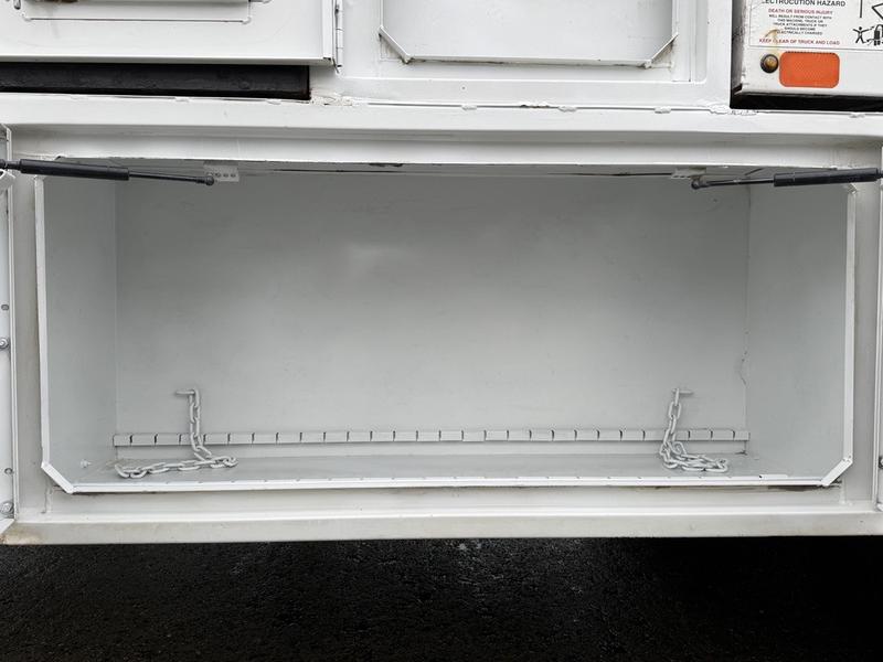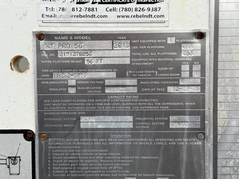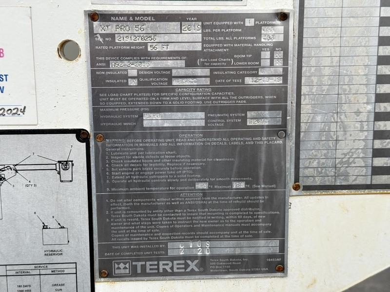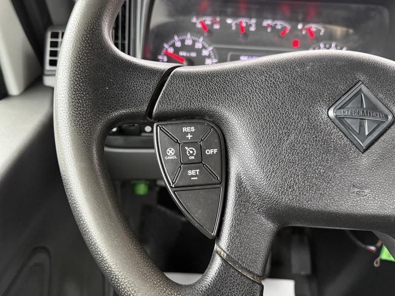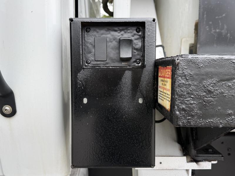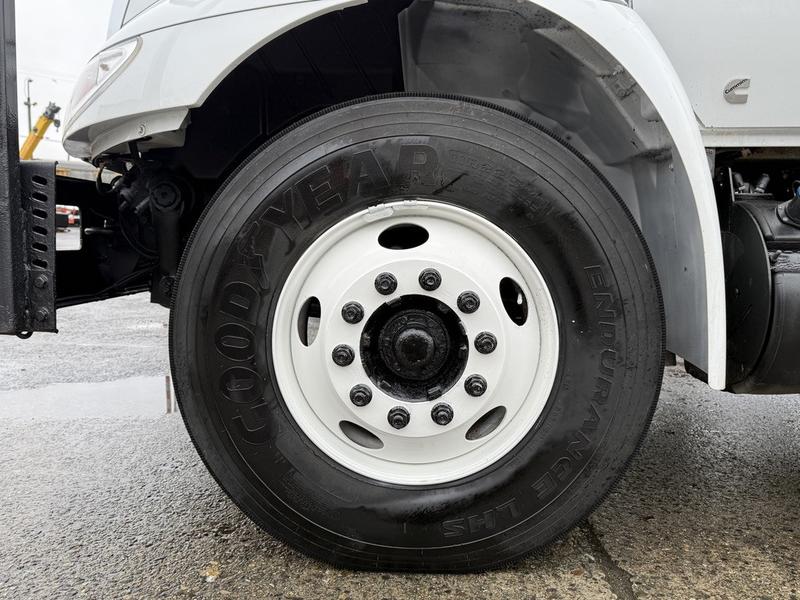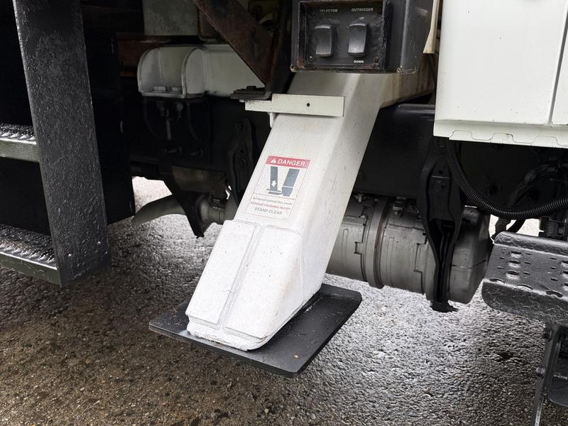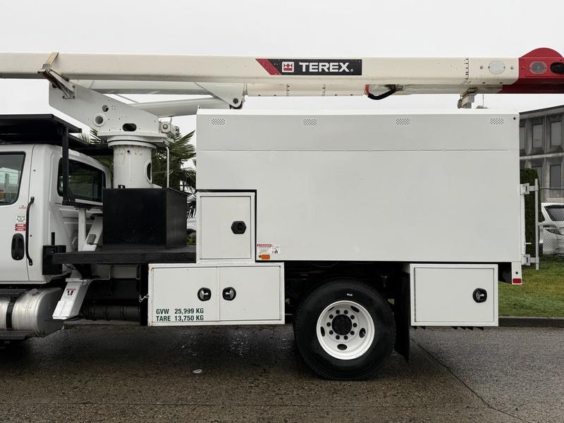 This 2020 International MV607 Cummins Terex bucket truck with dumping service body is powered by a 6.7L Cummins diesel engine paired with an automatic transmission and rear-wheel drive. It is equipped with a Terex XT PRO 56 aerial lift offering a 56-foot platform height and a 400 lb rated capacity, making it well suited for utility, electrical, municipal, and maintenance applications. The enclosed service body includes multiple storage compartments, PTO-driven hydraulics, outriggers with slope indicators, and boom control systems, along with a hydraulic dump function designed to unload material from the rear body. Additional features include hydraulic brakes, strobe lights, air conditioning and heat, cruise control, AM/FM radio, USB and 12V inputs, and cup holders. Finished in white with a grey cloth interior, this MV607 has an overall length of 32 feet 1 inch, a width of 8 feet 4 inches, a height of 12 feet 4 inches, and a GVWR of 11,792 kg (25,999 lb).