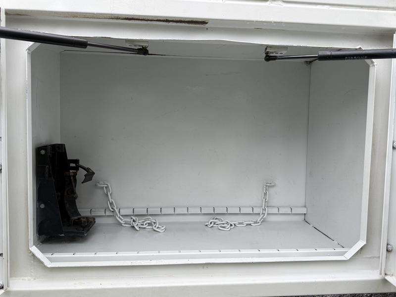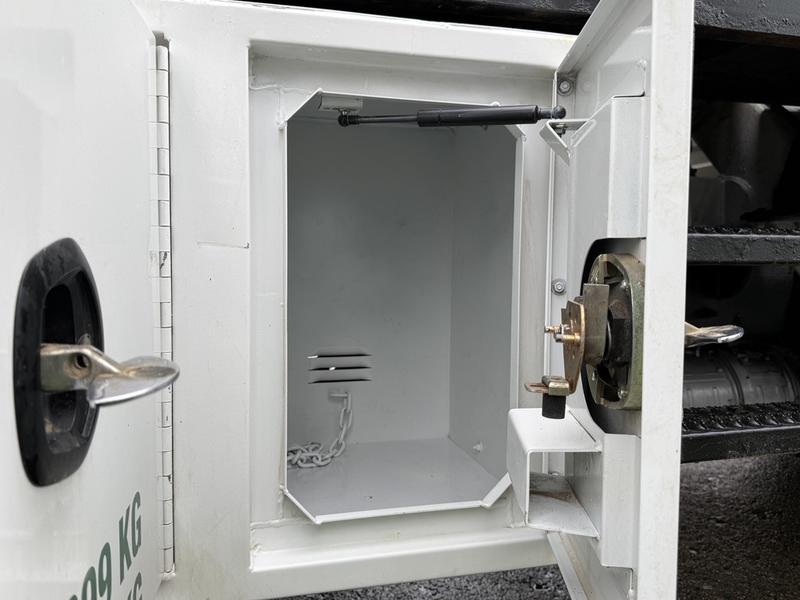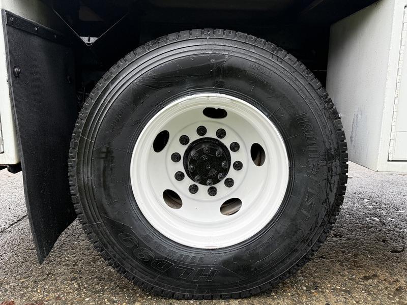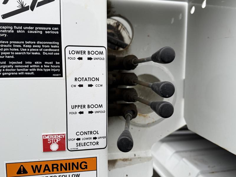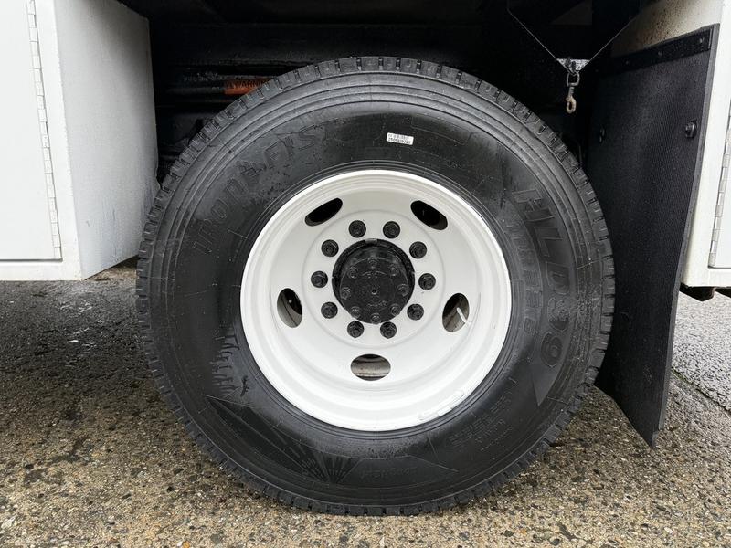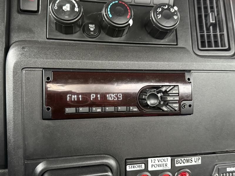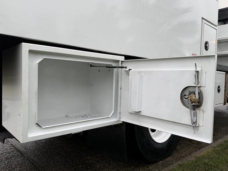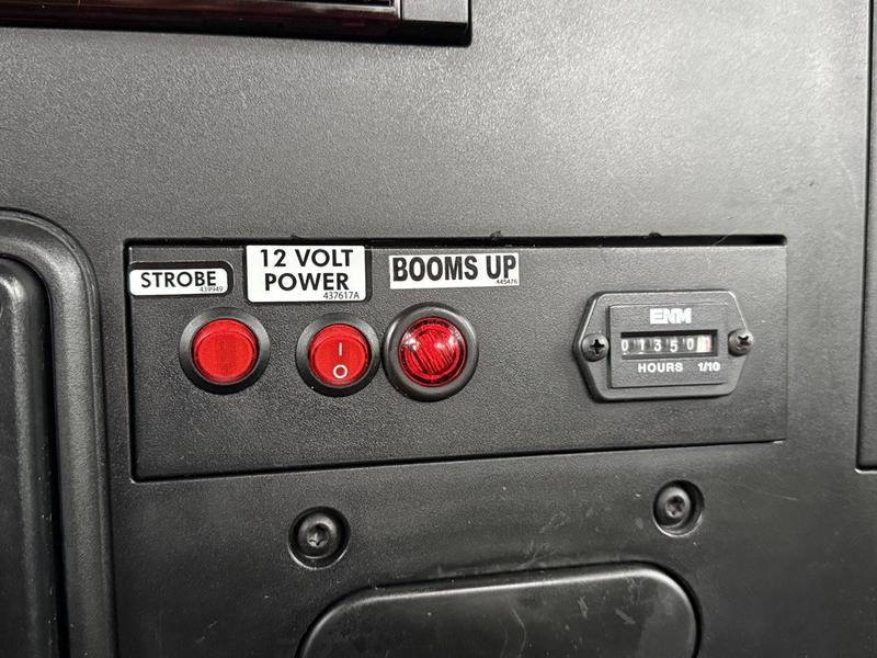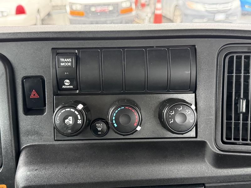 This 2020 International MV607 Cummins Terex bucket truck with dumping service body is powered by a 6.7L Cummins diesel engine paired with an automatic transmission and rear-wheel drive. It is equipped with a Terex XT PRO 56 aerial lift offering a 56-foot platform height and a 400 lb rated capacity, making it well suited for utility, electrical, municipal, and maintenance applications. The enclosed service body includes multiple storage compartments, PTO-driven hydraulics, outriggers with slope indicators, and boom control systems, along with a hydraulic dump function designed to unload material from the rear body. Additional features include hydraulic brakes, strobe lights, air conditioning and heat, cruise control, AM/FM radio, USB and 12V inputs, and cup holders. Finished in white with a grey cloth interior, this MV607 has an overall length of 32 feet 1 inch, a width of 8 feet 4 inches, a height of 12 feet 4 inches, and a GVWR of 11,792 kg (25,999 lb).