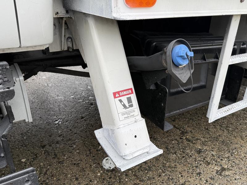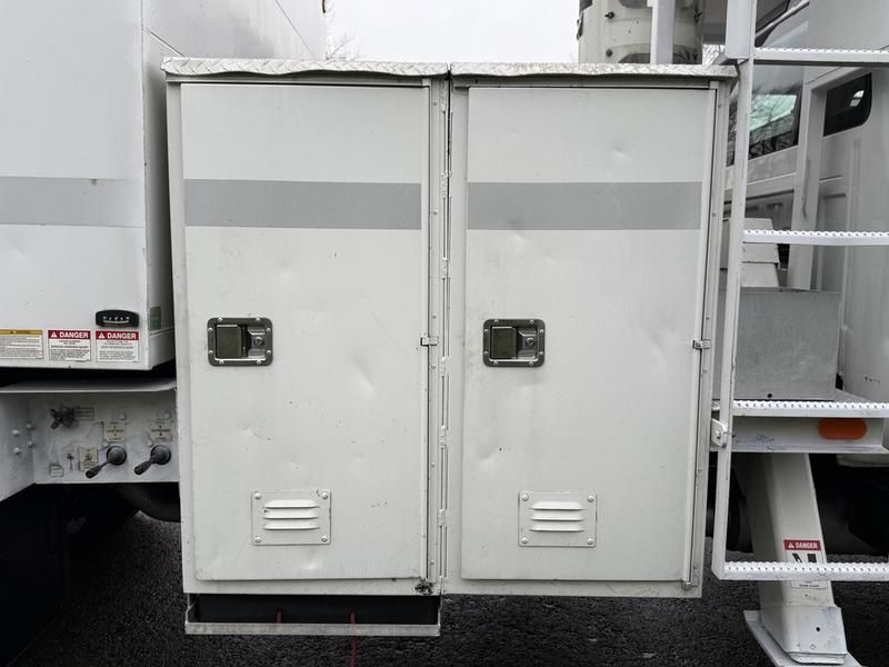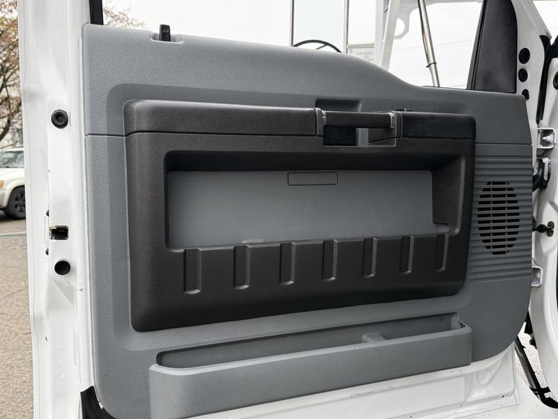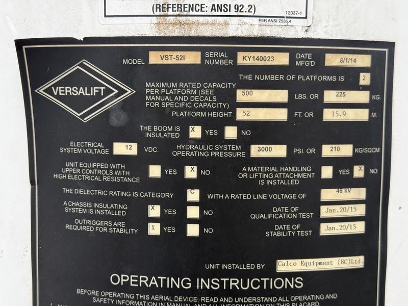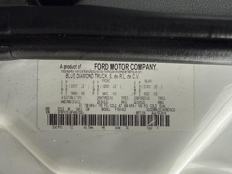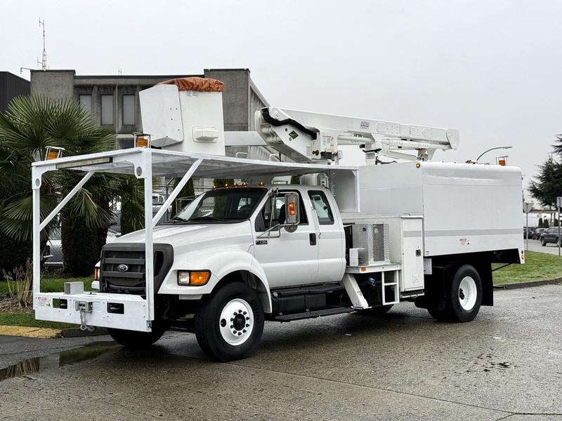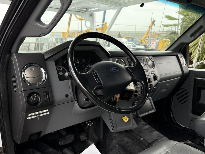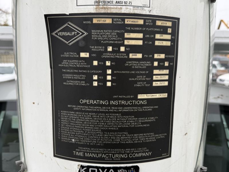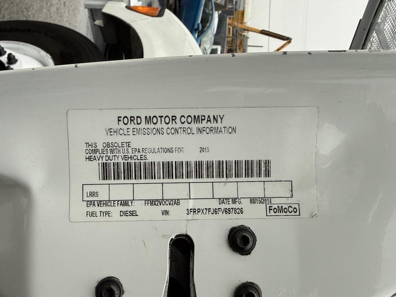 This 2015 Ford F-750 XLT Super Duty Cummins Versalift bucket truck with an 11-foot dump box is powered by a 6.7L 6-cylinder Cummins diesel engine paired with an automatic transmission and rear-wheel drive, making it well suited for commercial utility, electrical, municipal, and infrastructure applications. It is equipped with a Versalift VST-52I aerial lift offering a 52-foot platform height and a 500 lb platform capacity, along with hydraulic outriggers, PTO operation, and a pony engine for auxiliary power. The integrated dump box measures approximately 11 feet long, 6 feet 7 inches wide, and 5 feet high, allowing material transport and dumping functionality in addition to aerial work. Additional features include hydraulic brakes, reverse camera, strobe and body lights, air conditioning and heat, cruise control, AM/FM radio, power windows and door locks, cup holders, and onboard storage. Finished in white with a grey vinyl interior, this F-750 bucket truck has overall measurements of approximately 29 feet 9 inches long, 8 feet 8 inches wide, and 12 feet 4 inches high, with a GVWR of 14,968 kg (33,000 lb).