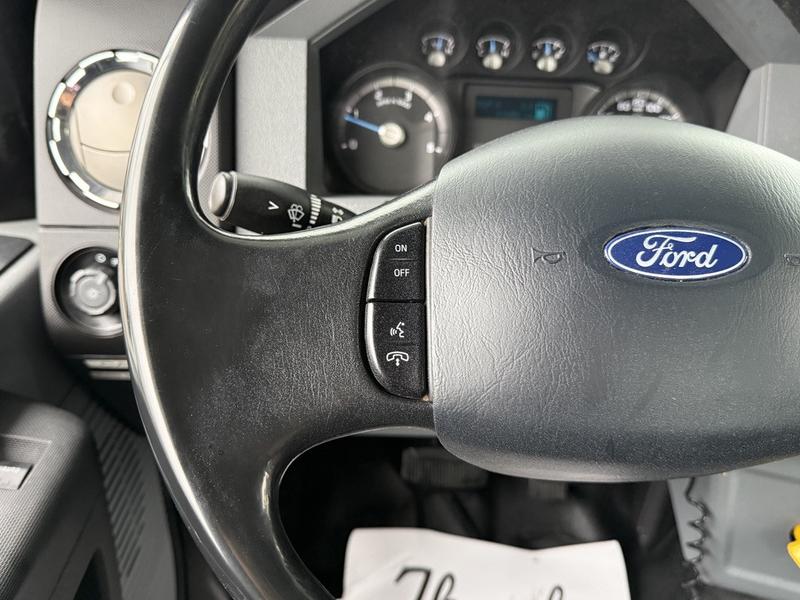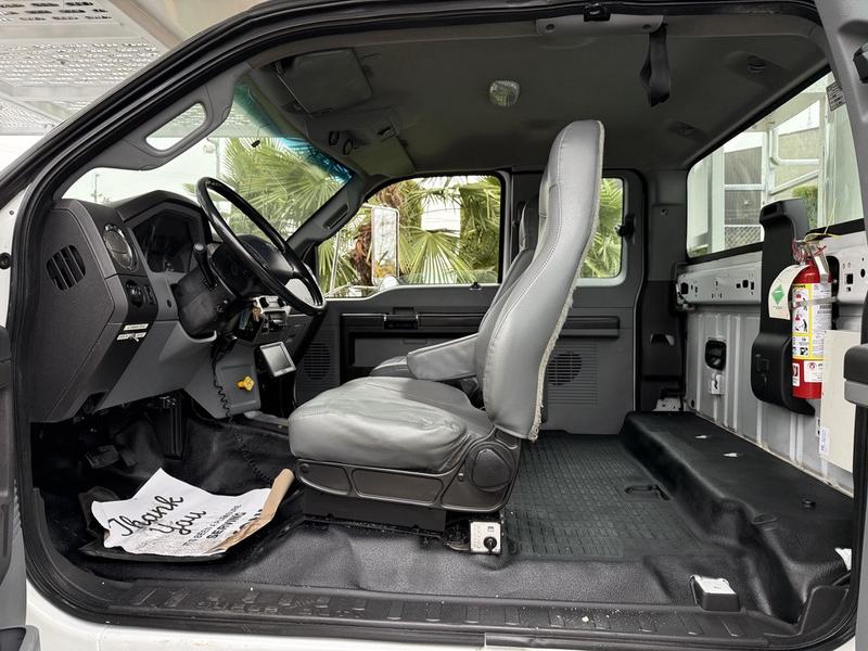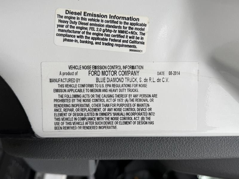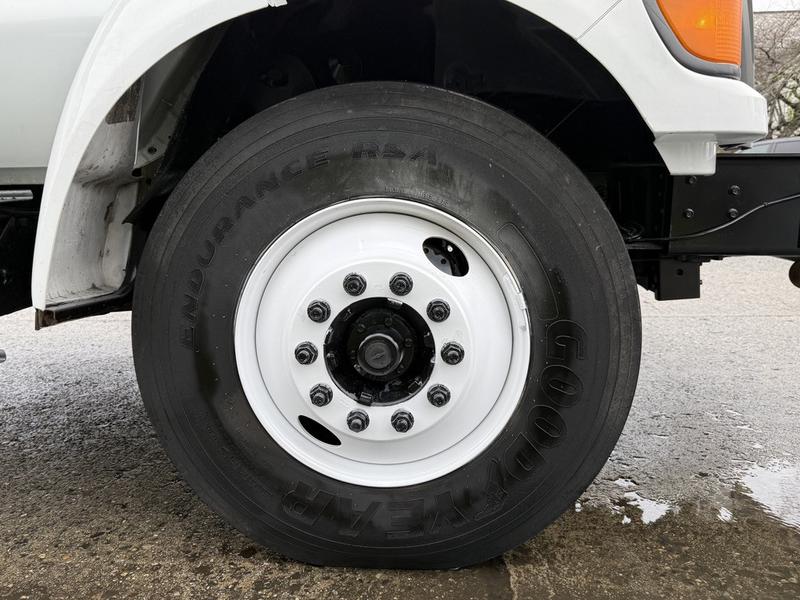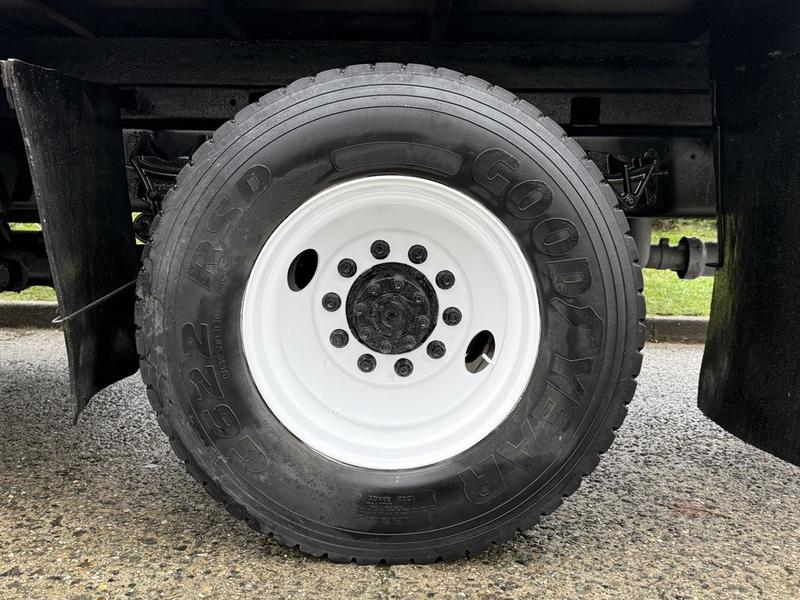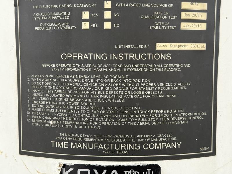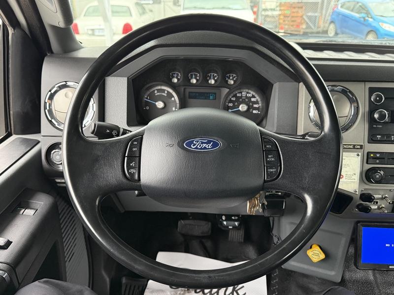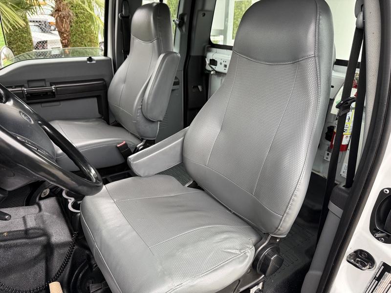 This 2015 Ford F-750 XLT Super Duty Cummins Versalift bucket truck with an 11-foot dump box is powered by a 6.7L 6-cylinder Cummins diesel engine paired with an automatic transmission and rear-wheel drive, making it well suited for commercial utility, electrical, municipal, and infrastructure applications. It is equipped with a Versalift VST-52I aerial lift offering a 52-foot platform height and a 500 lb platform capacity, along with hydraulic outriggers, PTO operation, and a pony engine for auxiliary power. The integrated dump box measures approximately 11 feet long, 6 feet 7 inches wide, and 5 feet high, allowing material transport and dumping functionality in addition to aerial work. Additional features include hydraulic brakes, reverse camera, strobe and body lights, air conditioning and heat, cruise control, AM/FM radio, power windows and door locks, cup holders, and onboard storage. Finished in white with a grey vinyl interior, this F-750 bucket truck has overall measurements of approximately 29 feet 9 inches long, 8 feet 8 inches wide, and 12 feet 4 inches high, with a GVWR of 14,968 kg (33,000 lb).